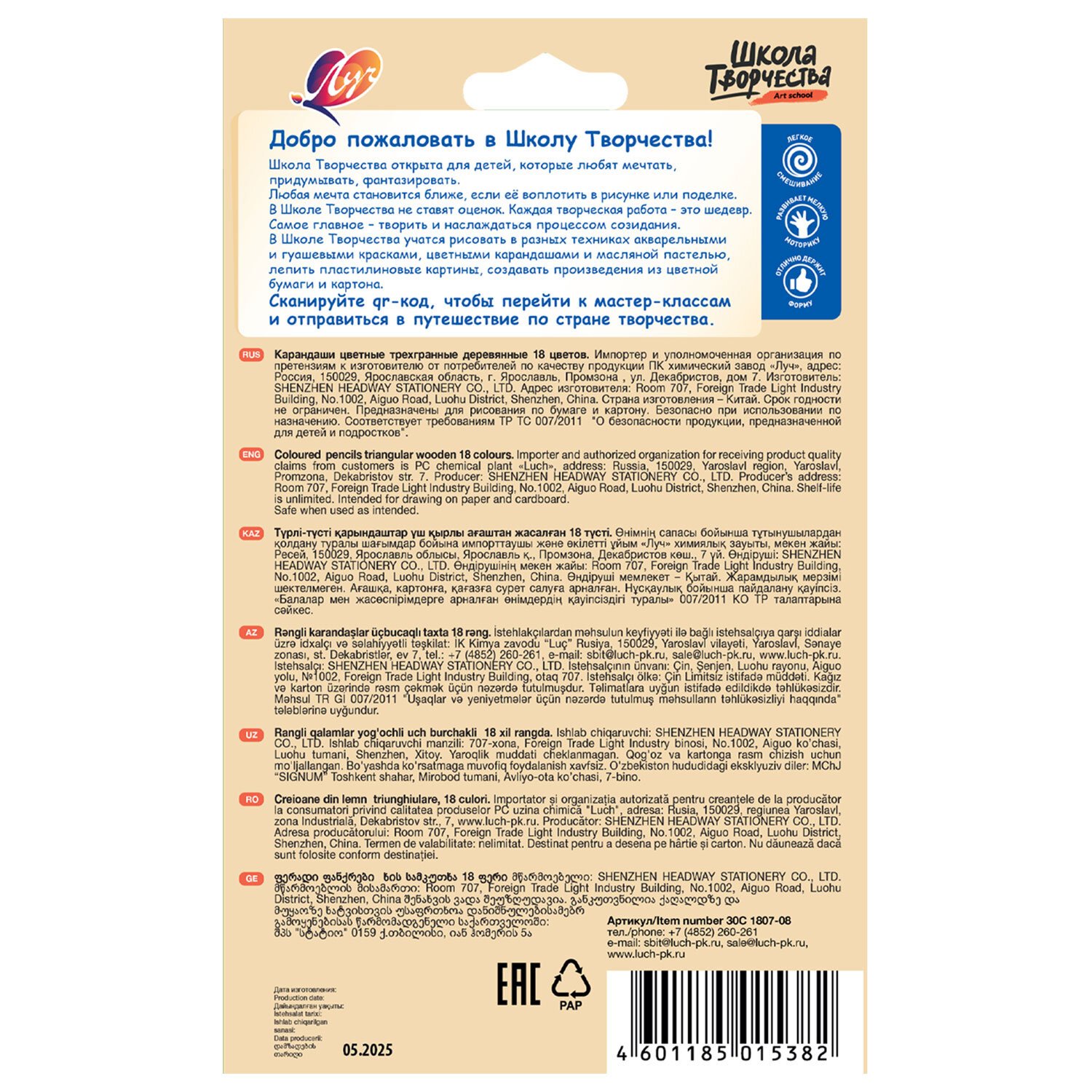 Карандаши цветные ЛУЧ "Школа Творчества", 18 цветов, трехгранные, натуральное дерево, 30С 1807-08