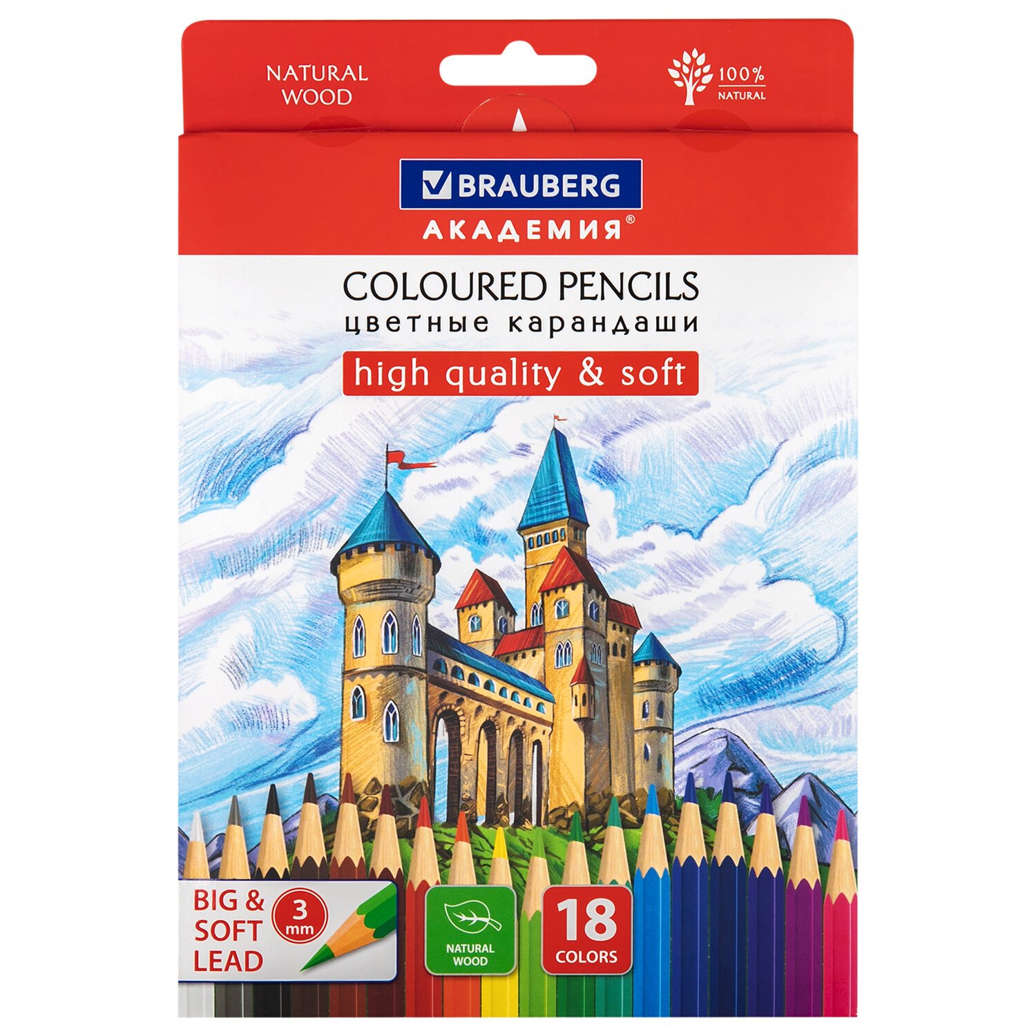 Карандаши цветные мягкие BRAUBERG АКАДЕМИЯ, 18 цветов, шестигранные, грифель 3 мм, натуральное дерево, 181865