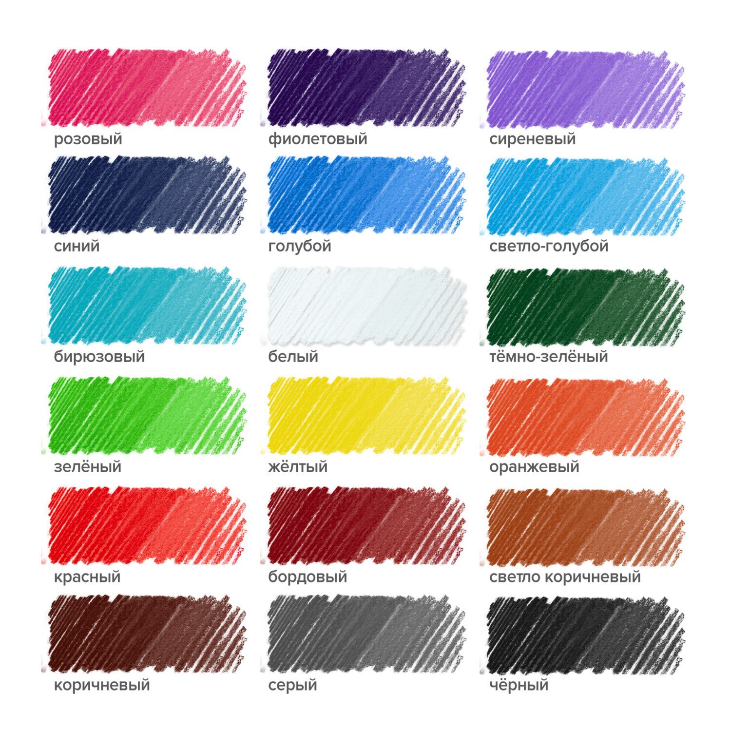 В наборе 18 цветов: черный, темно-синий, синий, голубой, салатовый, зеленый, темно-зеленый, желтый, оранжевый, фуксия, розовый, красный, бордовый, серый, светло-серый, фиолетовый, темно-коричневый, коричневый.