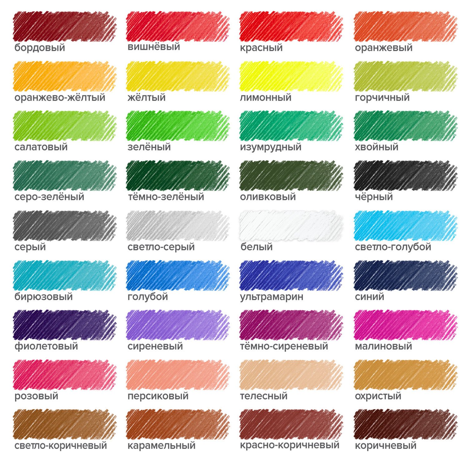 В наборе 36 цветов: темно-синий, синий, фиолетовый, сиреневый, пурпурный, коралловый, розовый, бежевый, бледно-розовый, бордовый, красный, алый, темно-оранжевый, канареечный, оранжевый, желтый, бледно-желтый, белый, серебристый, золотистый, черный, серый, темно-зеленый, болотный, зеленый, бирюзовый, салатовый, бледно-зеленый, светло-серый, темно-коричневый, коричневый, каштановый, светло-коричневый, песочный, голубой, синий.