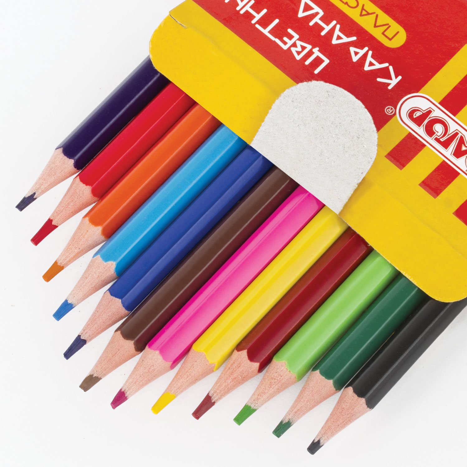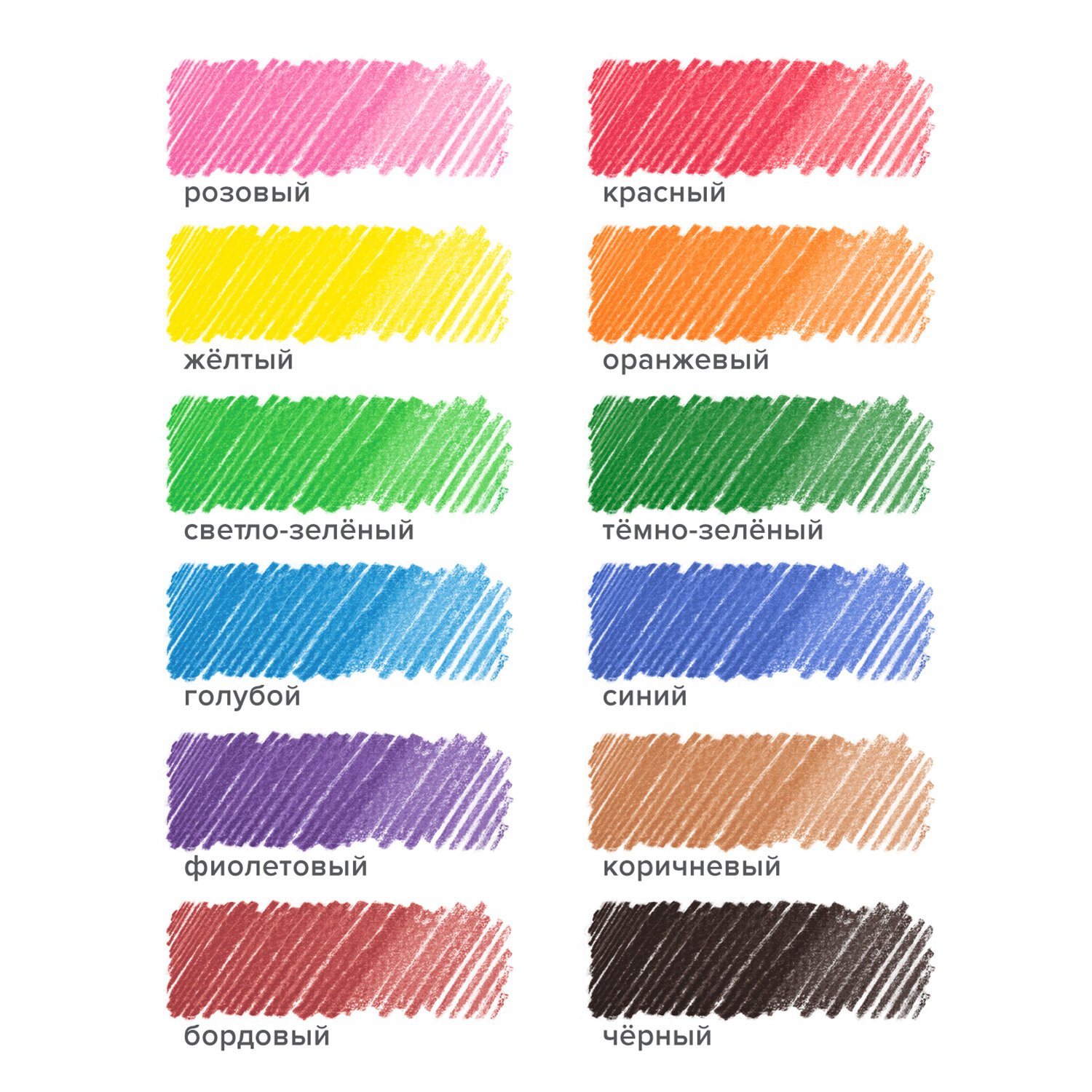 Набор состоит из 12 цветов: розовый, красный, желтый, оранжевый, салатовый, зеленый, голубой, синий, фиолетовый, коричневый, серый, черный. Шестигранная форма сечения корпуса позволяет карандашу не скатываться с поверхности стола во время занятий рисованием. Карандаши изготовлены из пластика и имеют лакированный корпус, который при разломе не образует острые края и безопасен для детей. Легко затачиваются. Грифель диаметром 2,65 мм обладает повышенной прочностью. Все карандаши заточены и поставляются в картонной упаковке с европодвесом.