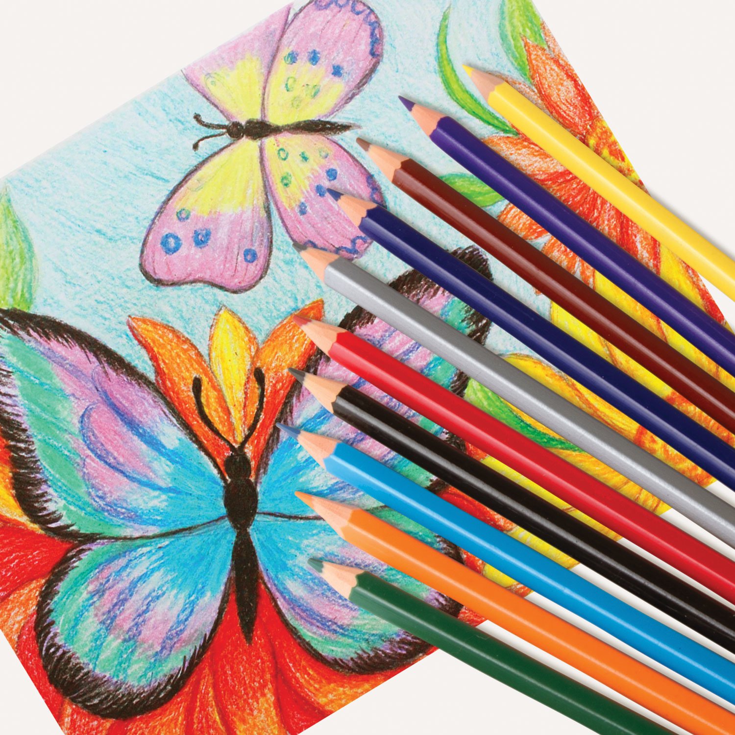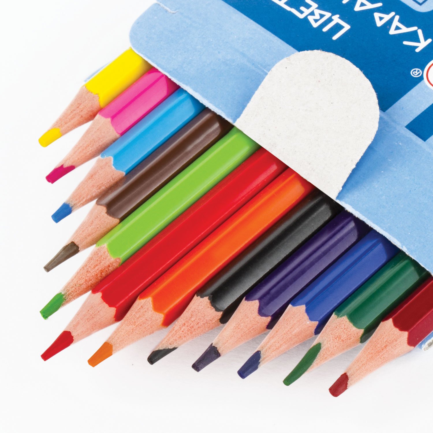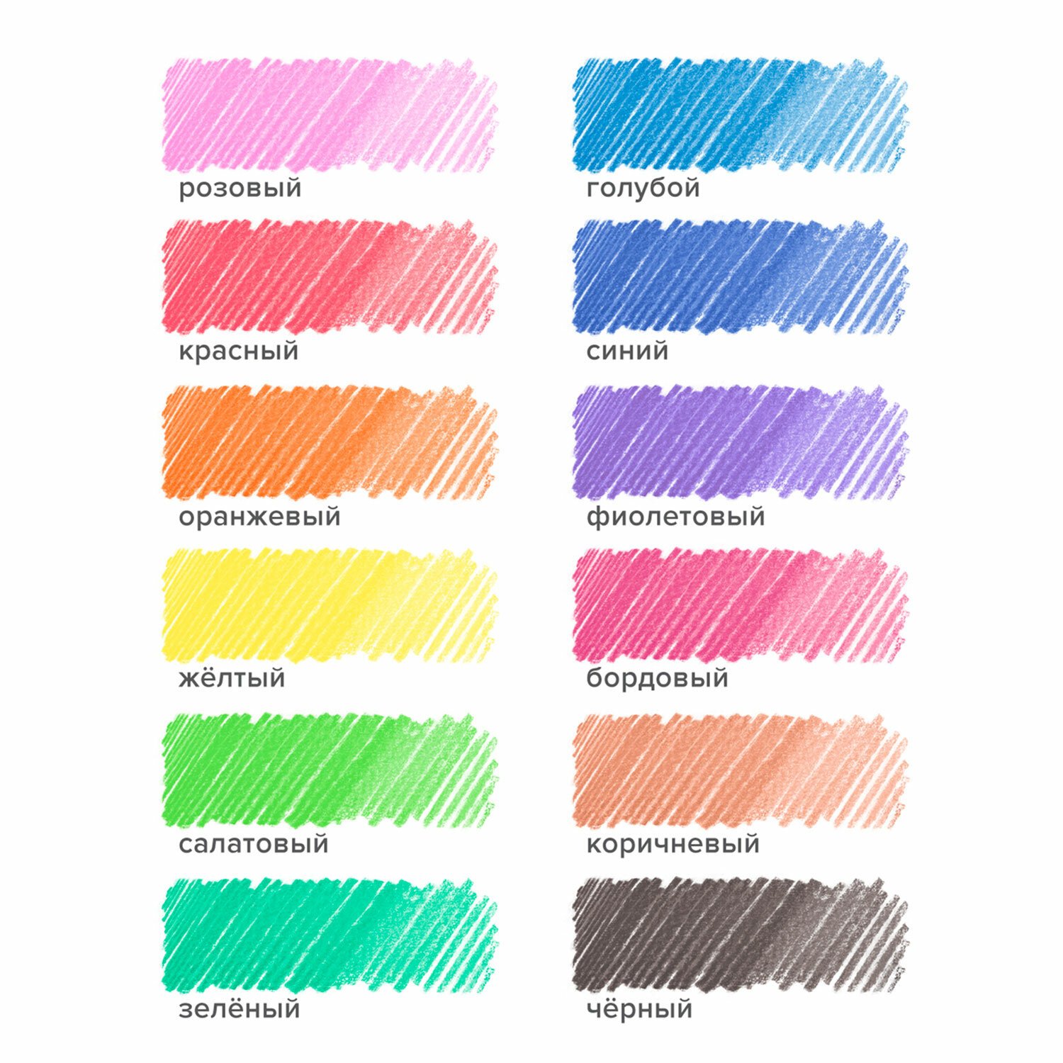 Набор состоит из 12 цветов: розовый, красный, желтый, оранжевый, салатовый, зеленый, голубой, синий, фиолетовый, коричневый, серый, черный. Шестигранная форма сечения корпуса позволяет карандашу не скатываться с поверхности стола во время занятий рисованием. Карандаши изготовлены из пластика и имеют лакированный корпус, который при разломе не образует острые края и безопасен для детей. Легко затачиваются. Грифель диаметром 2,65 мм обладает повышенной прочностью. Все карандаши заточены и поставляются в картонной упаковке с европодвесом.