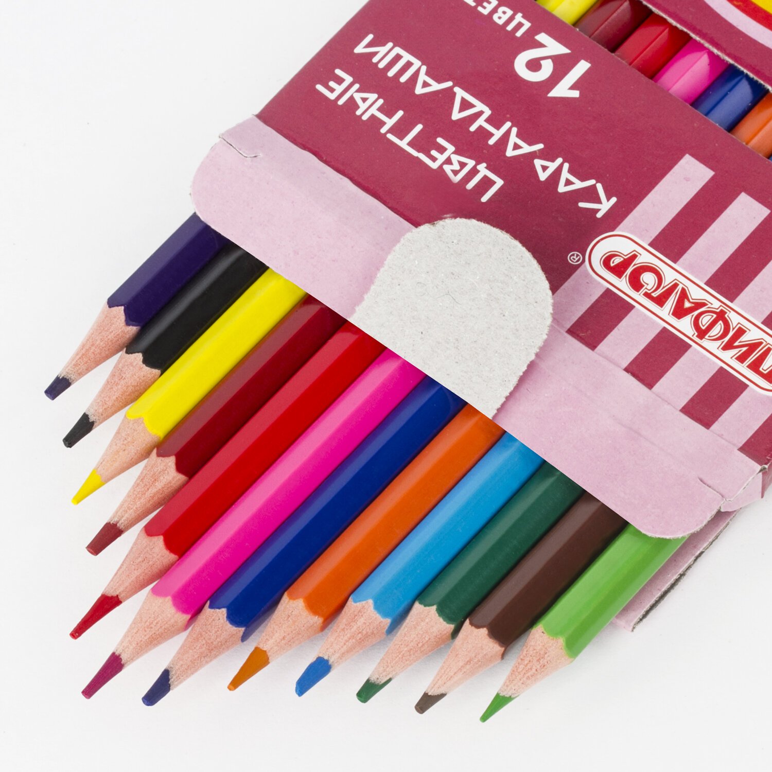 Набор состоит из 12 цветов: розовый, красный, желтый, оранжевый, салатовый, зеленый, голубой, синий, фиолетовый, коричневый, серый, черный. Шестигранная форма сечения корпуса позволяет карандашу не скатываться с поверхности стола во время занятий рисованием. Карандаши изготовлены из пластика и имеют лакированный корпус, который при разломе не образует острые края и безопасен для детей. Легко затачиваются. Грифель диаметром 2,65 мм обладает повышенной прочностью. Все карандаши заточены и поставляются в картонной упаковке с европодвесом.