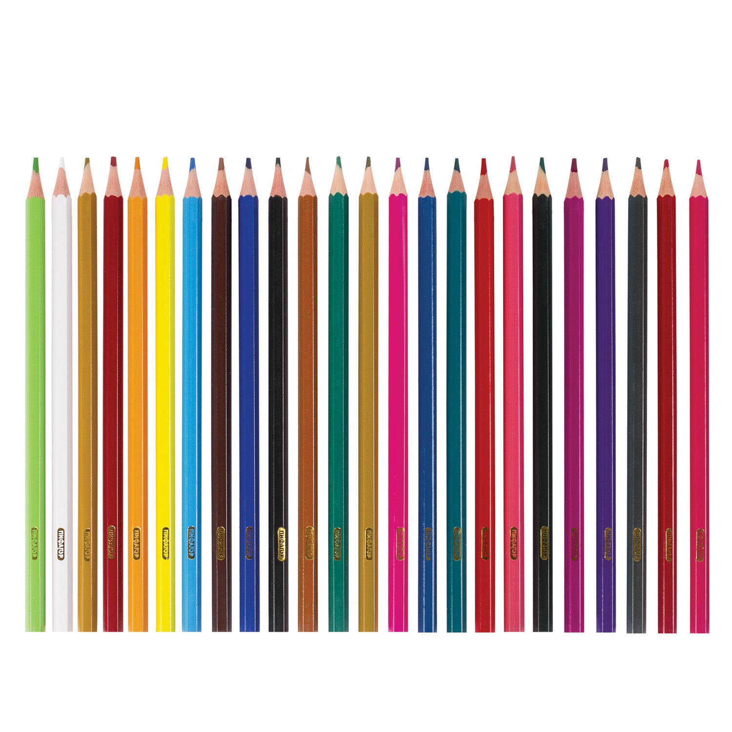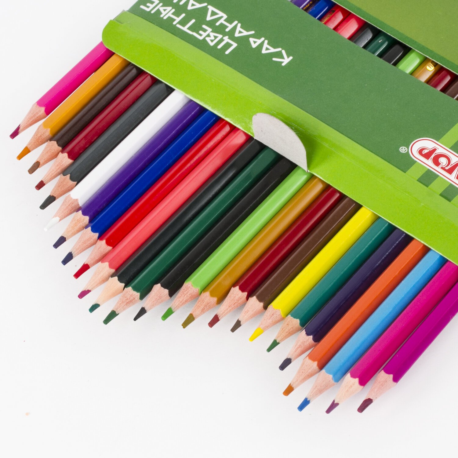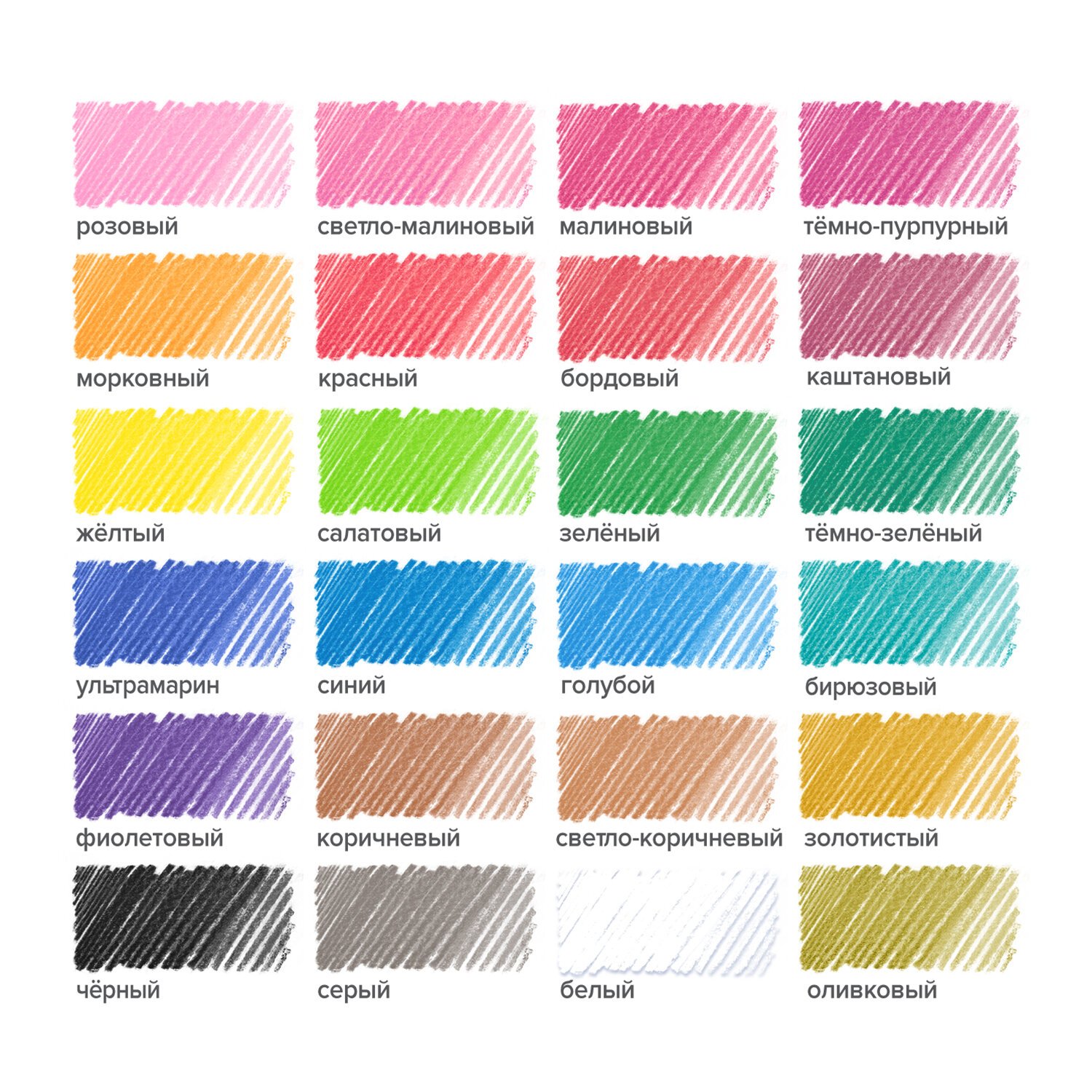 Набор состоит из 24 цветов: белый, каштановый, темно-коричневый, бежевый, малиновый, розовый, коричневый, коралловый, красный, персиковый, серый, оранжевый, канареечный, желтый, салатовый, светло-зеленый, бирюзовый, зеленый, темно-синий, темно-зеленый, синий, фиолетовый, сиреневый, черный. Шестигранная форма сечения корпуса позволяет карандашу не скатываться с поверхности стола во время занятий рисованием. Карандаши изготовлены из пластика и имеют лакированный корпус, который при разломе не образует острые края и безопасен для детей. Легко затачиваются. Грифель диаметром 2,65 мм обладает повышенной прочностью. Все карандаши заточены и поставляются в картонной упаковке с европодвесом.