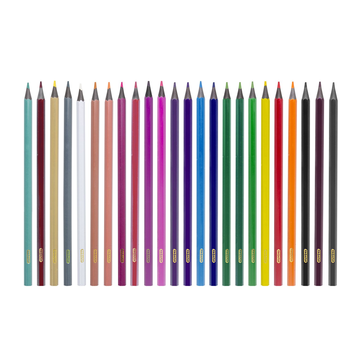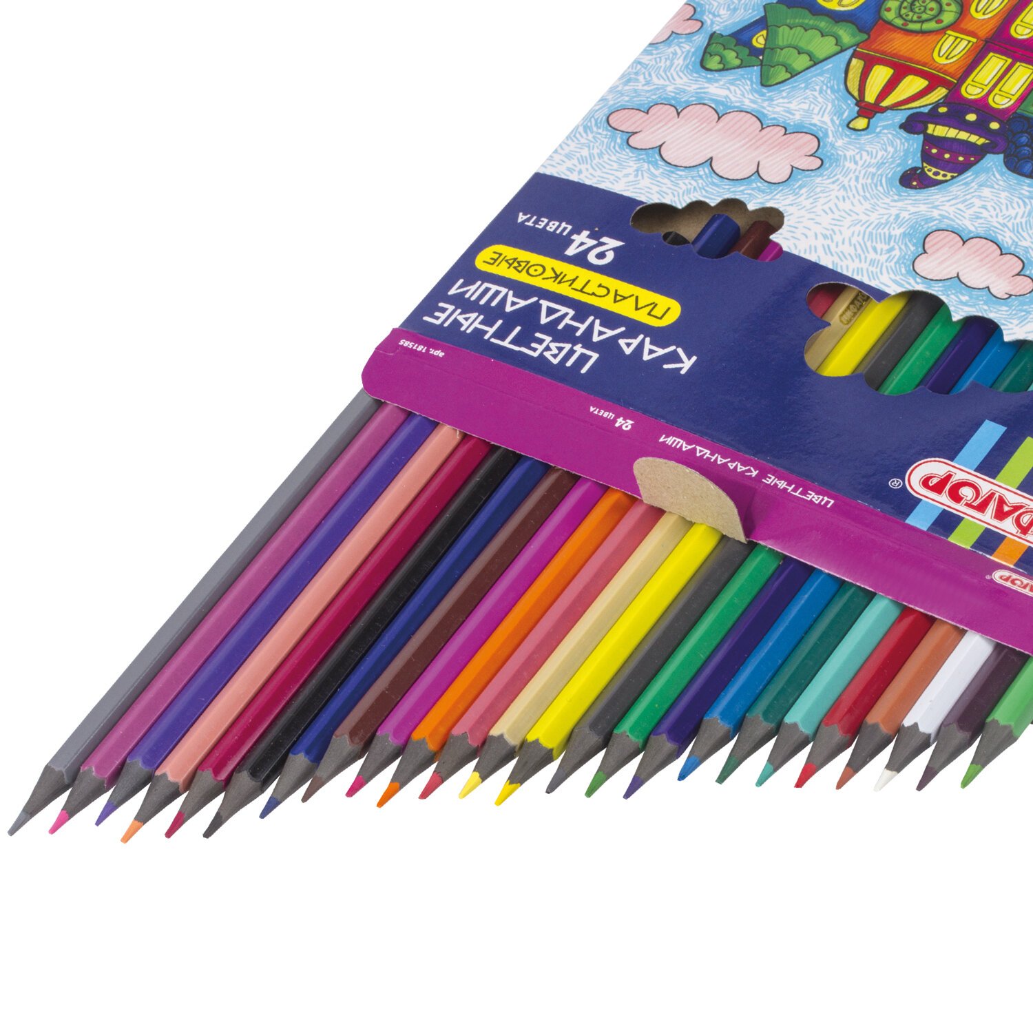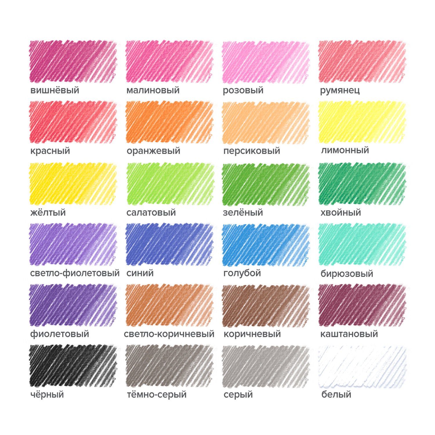 Набор состоит из 24 цветов: белый, бордовый, красный, алый, розовый, пурпурный, желтый, канареечный, оранжевый, салатовый, светло-зеленый, зеленый, темно-зеленый, голубой, синий, темно-синий, фиолетовый, темно-фиолетовый, светло-коричневый, коричневый, темно-коричневый, каштановый, серый, черный. Шестигранная форма сечения корпуса позволяет карандашу не скатываться с поверхности стола во время занятий рисованием. Карандаши изготовлены из переработанного пластика и имеют лакированный корпус, который при разломе не образует острые края и безопасен для детей. Легко затачиваются. Грифель диаметром 2,65 мм обладает повышенной прочностью. Все карандаши заточены и поставляются в картонной упаковке с европодвесом.
