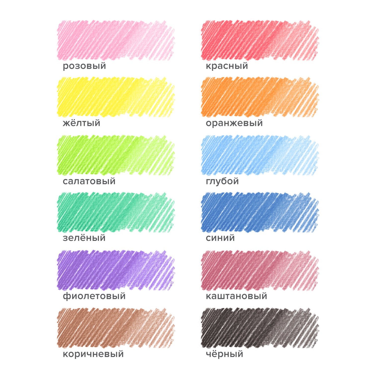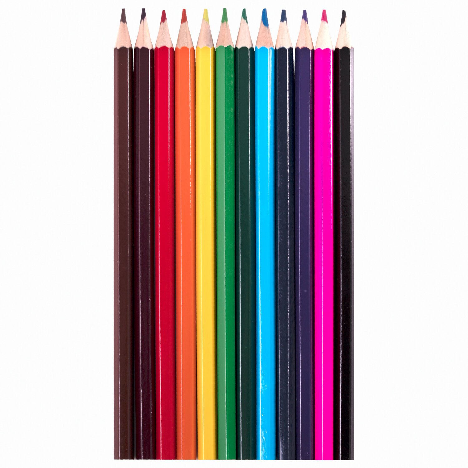 Набор состоит из 12 цветов: розовый, красный, желтый, оранжевый, салатовый, зеленый, голубой, синий, фиолетовый, коричневый, темно-коричневый, черный. Шестигранная форма сечения корпуса позволяет не скатываться карандашу с поверхности стола во время занятий рисованием. Карандаши изготовлены из высокосортной белой древесины ценных пород и имеют лакированный корпус. Качество древесины и исполнения гарантирует легкую заточку. Грифель из натуральных материалов и пигментов диаметром 2.5 мм обладает повышенной прочностью. Все карандаши заточены и поставляются в картонной упаковке с европодвесом.