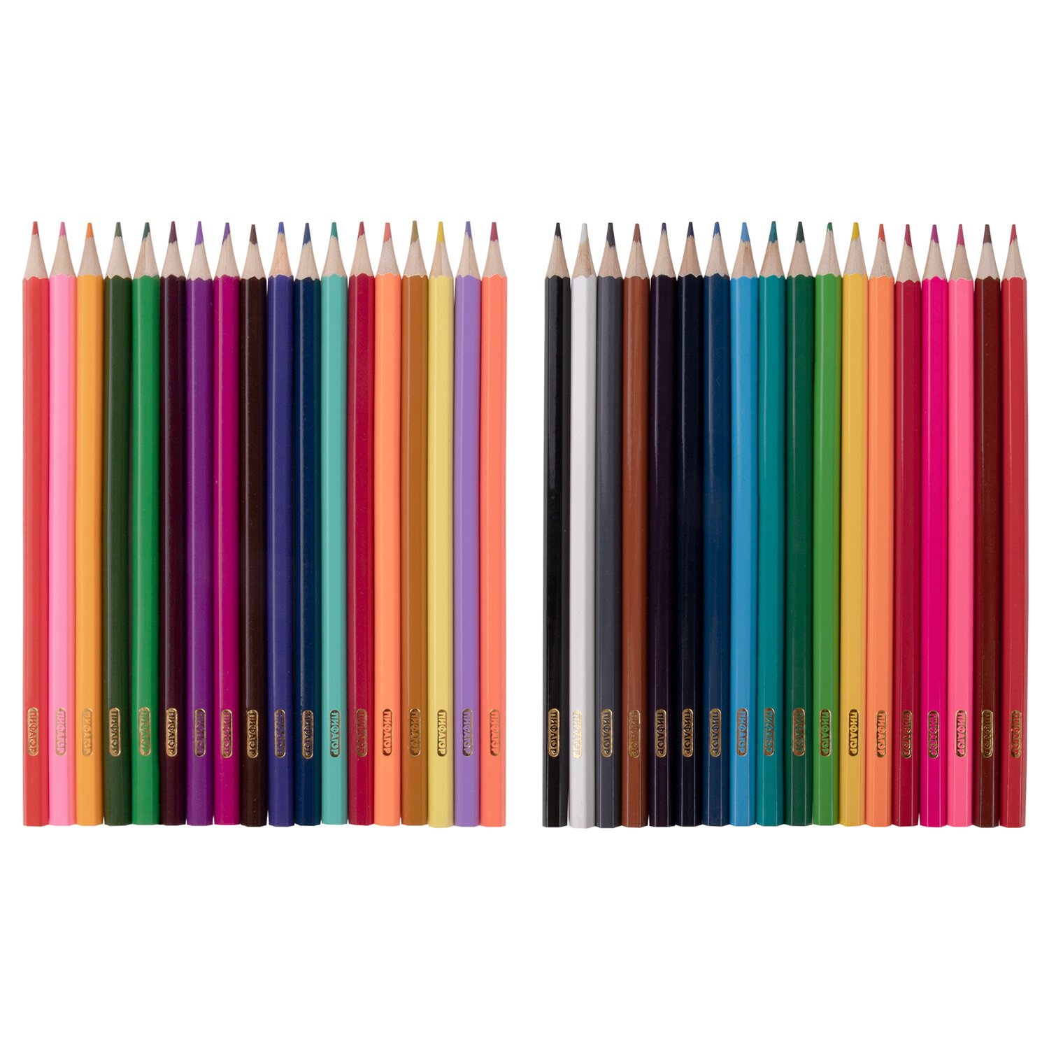 Набор состоит из 36 цветов: темно-синий, синий, фиолетовый, сиреневый, пурпурный, коралловый, розовый, бежевый, бледно-розовый, бордовый, красный, алый, темно-оранжевый, канареечный, оранжевый, желтый, бледно-желтый, белый, серебристый, золотистый, черный, серый, темно-зеленый, болотный, зеленый, бирюзовый, салатовый, бледно-зеленый, светло-серый, темно-коричневый, коричневый, каштановый, светло-коричневый, песочный, голубой, синий. Шестигранная форма сечения корпуса позволяет не скатываться карандашу с поверхности стола во время занятий рисованием. Они изготовлены из высокосортной белой древесины ценных пород и имеют лакированный корпус. Качество древесины и исполнения гарантируют легкую заточку. Грифель из натуральных материалов и пигментов диаметром 2,6 мм обладает повышенной прочностью. Все карандаши заточены и поставляются картонной упаковке с европодвесом.