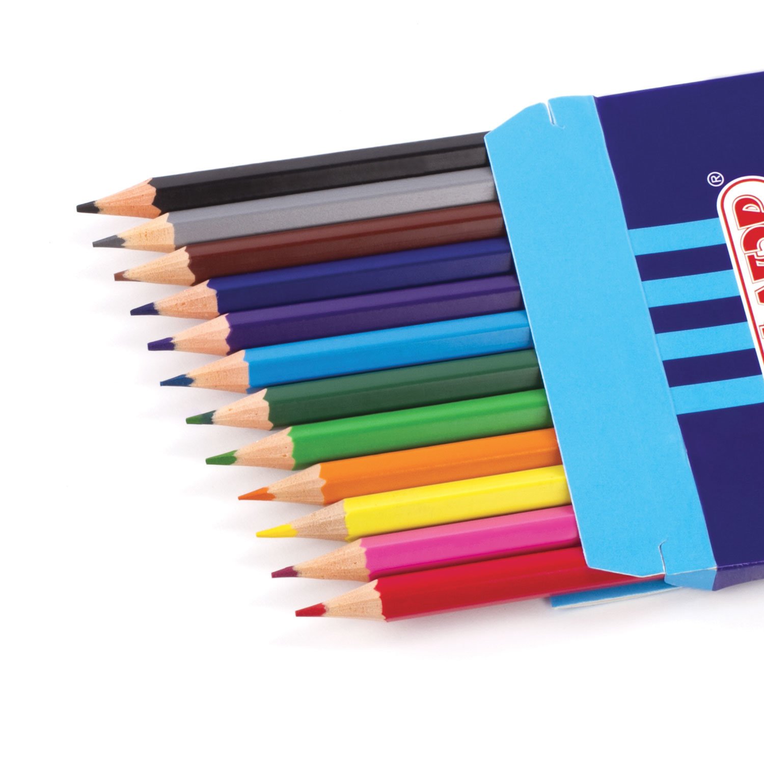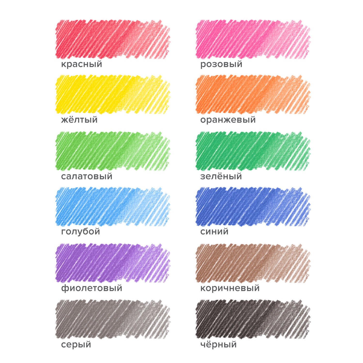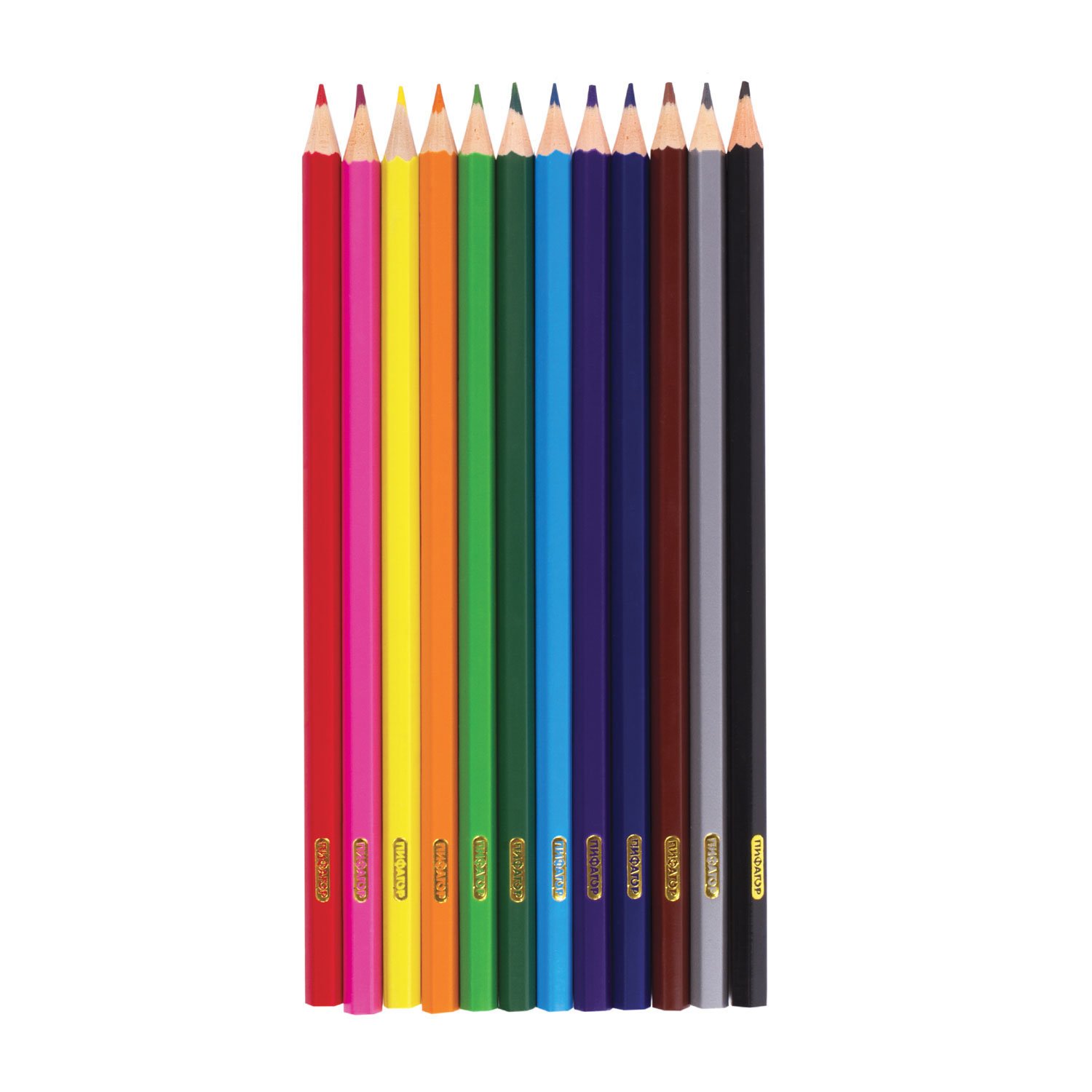Набор состоит из 12 цветов: розовый, красный, желтый, оранжевый, салатовый, зеленый, голубой, синий, фиолетовый, коричневый, серый, черный. Шестигранная форма сечения корпуса позволяет карандашу не скатываться с поверхности стола во время занятий рисованием. Карандаши изготовлены из пластика и имеют лакированный корпус, который при разломе не образует острые края и безопасен для детей. Легко затачиваются. Грифель диаметром 2,65 мм обладает повышенной прочностью. Все карандаши заточены и поставляются в картонной упаковке с европодвесом.