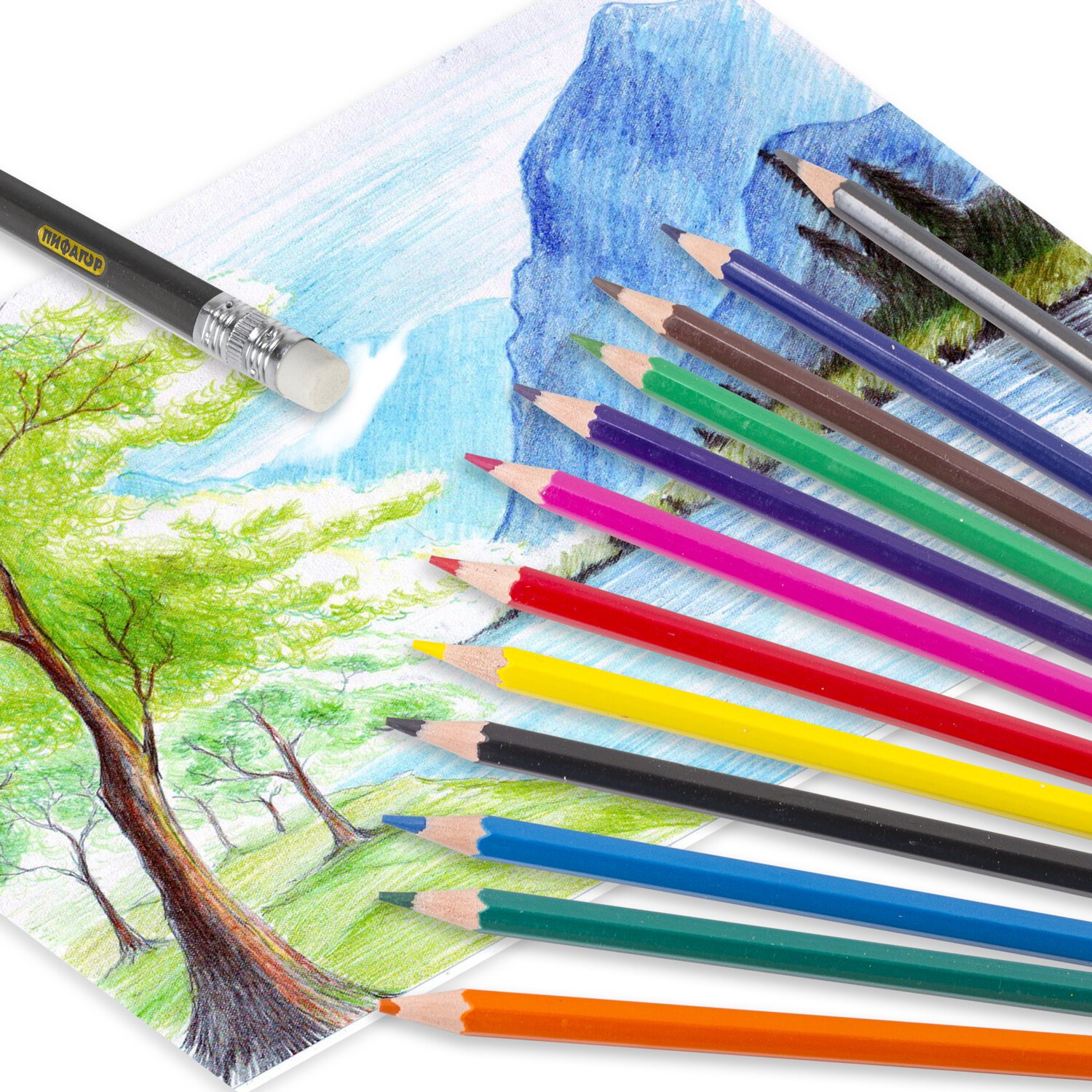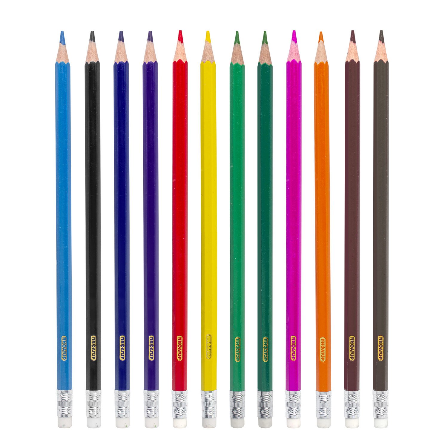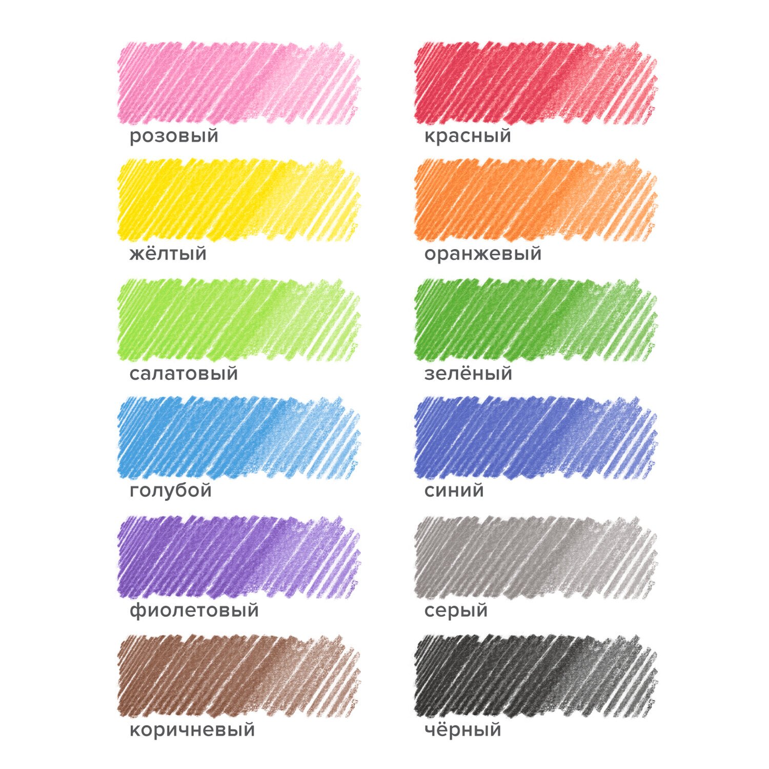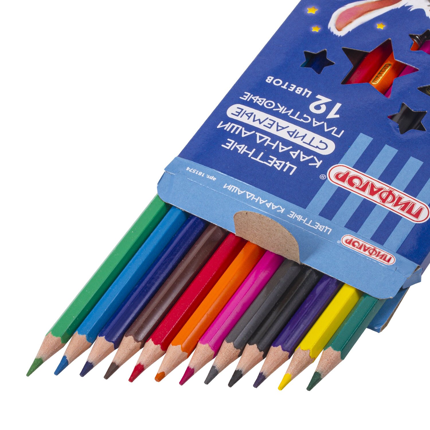 Набор состоит из 12 цветов: розовый, красный, желтый, оранжевый, салатовый, зеленый, голубой, синий, фиолетовый, коричневый, серый, черный. Шестигранная форма сечения корпуса позволяет карандашу не скатываться с поверхности стола во время занятий рисованием. Карандаши изготовлены из пластика и имеют лакированный корпус, который при разломе не образует острые края и безопасен для детей. Легко затачиваются. Особый грифель диаметром 3 мм обладает повышенной прочностью и легко стирается обычным ластиком. Все карандаши заточены, оснащены ластиком и поставляются в картонной упаковке с европодвесом.