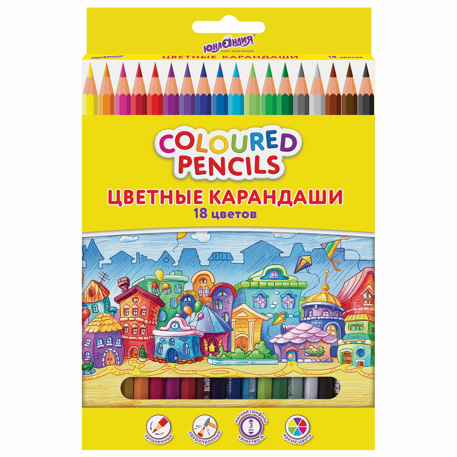 Карандаши цветные ЮНЛАНДИЯ "ДОМИКИ", 18 цветов, шестигранные, грифель 3 мм, 181837