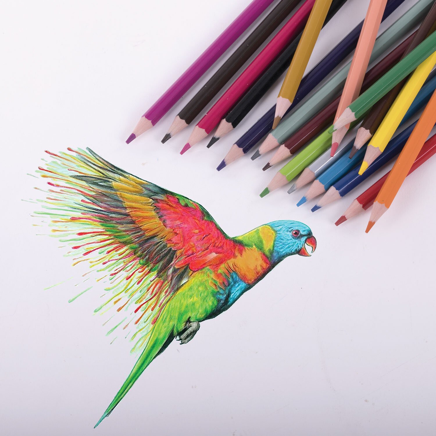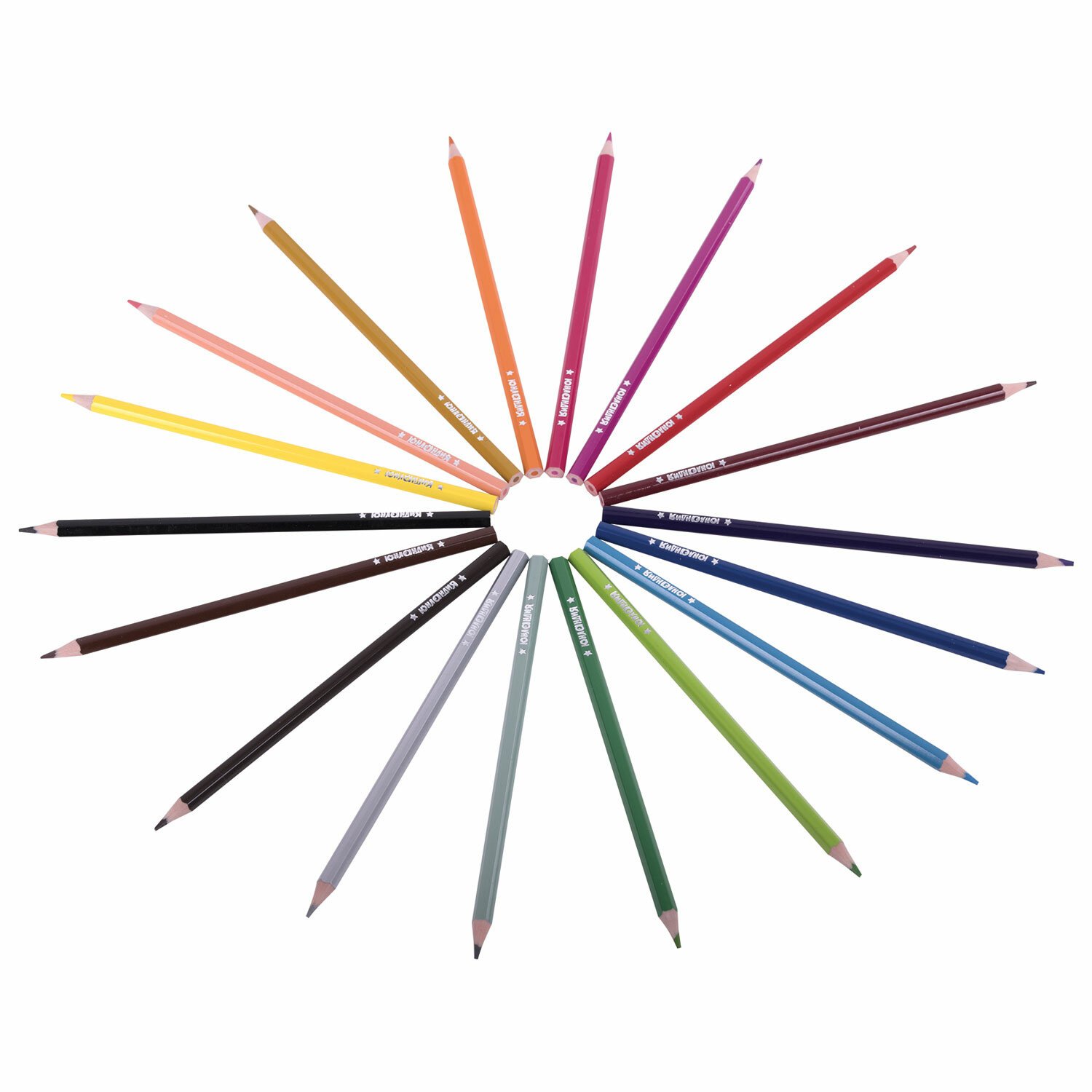 Набор состоит из 18 цветов: черный, темно-синий, синий, голубой, салатовый, зеленый, темно-зеленый, желтый, оранжевый, фуксия, розовый, красный, бордовый, серый, светло-серый, фиолетовый, темно-коричневый, коричневый. Шестигранная форма сечения корпуса позволяет не скатываться карандашу с поверхности стола во время занятий рисованием. Карандаши изготовлены из высококачественного пластика и имеют лакированный корпус. Качество исполнения гарантирует легкую заточку. Грифель диаметром 3 мм обладает повышенной прочностью. Все карандаши заточены и поставляются в картонной упаковке с европодвесом.