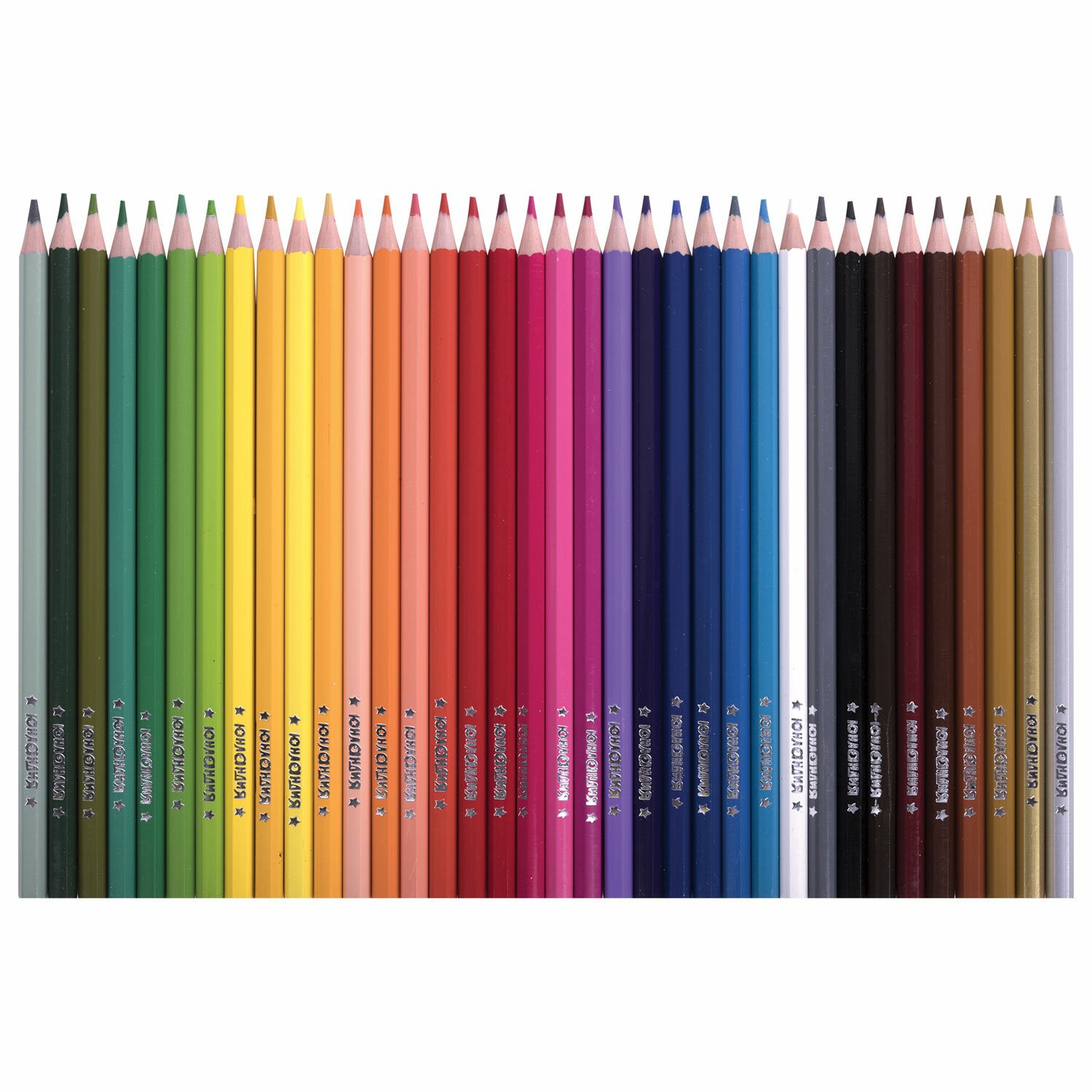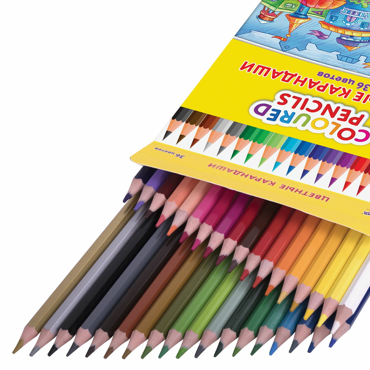 Набор состоит из 36 цветов: темно-синий, синий, фиолетовый, сиреневый, пурпурный, коралловый, розовый, бежевый, бледно-розовый, бордовый, красный, алый, темно-оранжевый, канареечный, оранжевый, желтый, бледно-желтый, белый, серебристый, золотистый, черный, серый, темно-зеленый, болотный, зеленый, бирюзовый, салатовый, бледно-зеленый, светло-серый, темно-коричневый, коричневый, каштановый, светло-коричневый, песочный, голубой, синий. Шестигранная форма сечения корпуса позволяет не скатываться карандашу с поверхности стола во время занятий рисованием. Они изготовлены из высококачественного пластика и имеют лакированный корпус. Качество исполнения гарантирует легкую заточку. Грифель диаметром 3 мм обладает повышенной прочностью. Все карандаши заточены и поставляются в картонной упаковке с европодвесом.