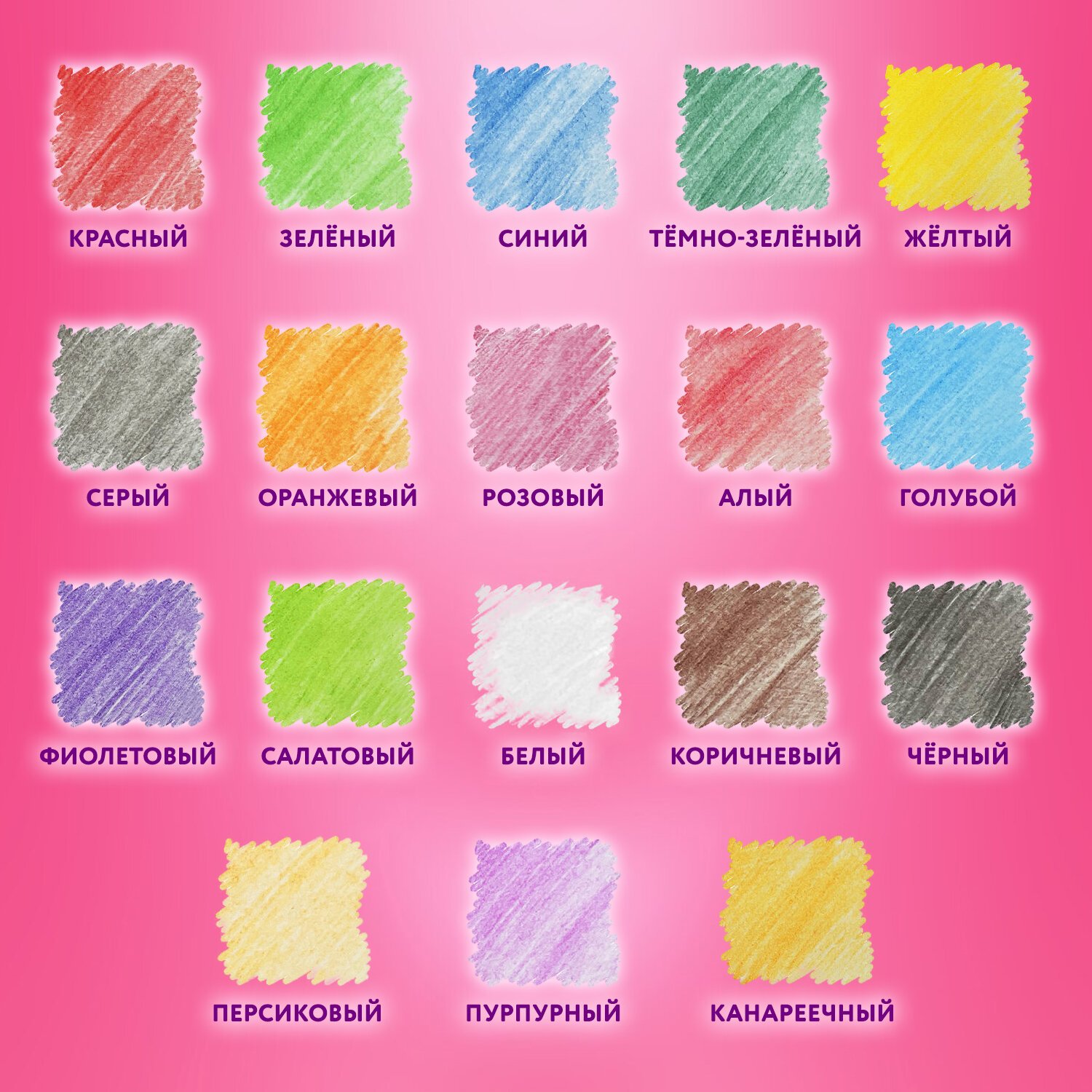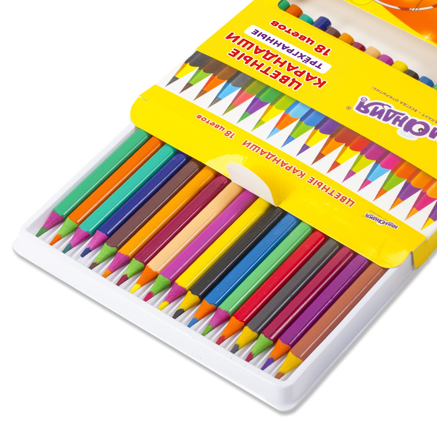 Набор состоит из 18 цветов: белый, красный, алый, розовый, пурпурный, желтый, канареечный, оранжевый, персиковый, салатовый, зеленый, темно-зеленый, голубой, синий, фиолетовый, коричневый, серый, черный. Яркие цвета развивают цветовосприятие ребенка. Трехгранная форма сечения корпуса позволяет не скатываться карандашу с поверхности стола во время занятий рисованием. Они изготовлены из необычного пластика разных цветов и имеют лакированный корпус. Качество пластика гарантирует легкую заточку. Мягкий грифель с диаметром 3 мм обладает повышенной прочностью, не ломается и не крошится при заточке. Все карандаши заточены и поставляются в картонной упаковке с европодвесом.
