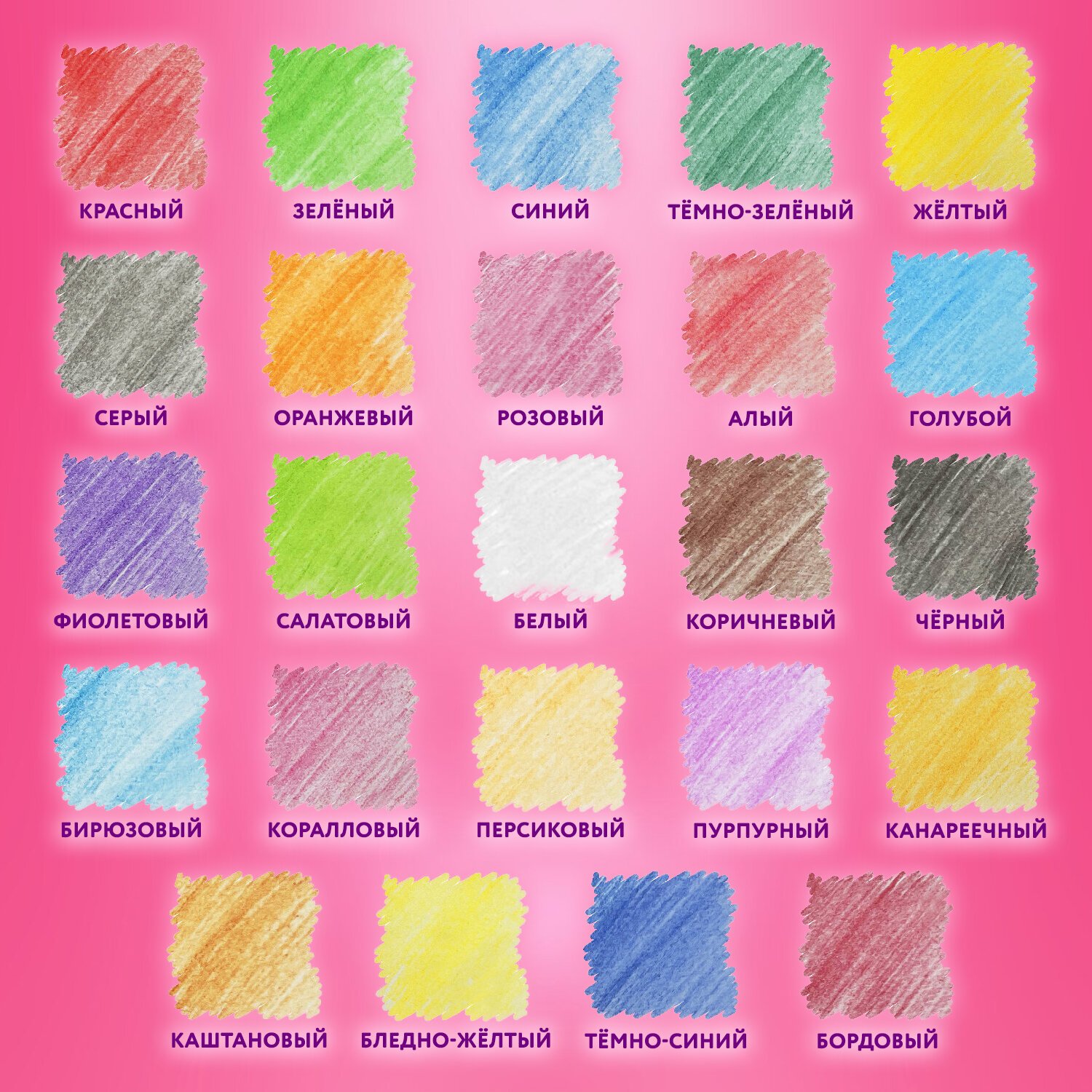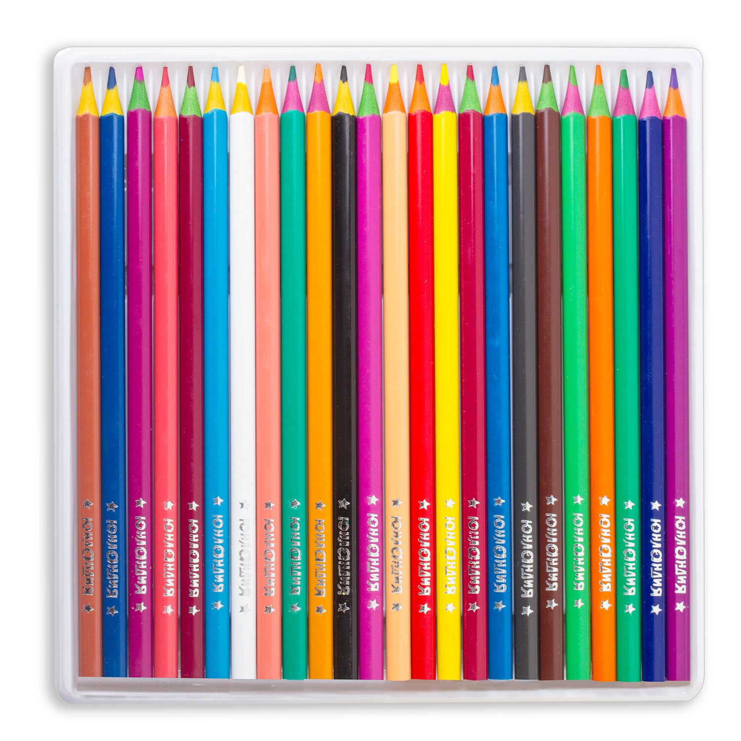 Набор состоит из 24 цветов: белый, каштановый, темно-коричневый, бежевый, малиновый, розовый, коричневый, коралловый, красный, персиковый, серый, оранжевый, канареечный, желтый, салатовый, светло-зеленый, бирюзовый, зеленый, темно-синий, темно-зеленый, синий, фиолетовый, сиреневый, черный. Яркие цвета развивают цветовосприятие ребенка. Трехгранная форма сечения корпуса позволяет не скатываться карандашу с поверхности стола во время занятий рисованием. Они изготовлены из необычного пластика разных цветов и имеют лакированный корпус. Качество пластика гарантирует легкую заточку. Мягкий грифель с диаметром 3 мм обладает повышенной прочностью, не ломается и не крошится при заточке. Все карандаши заточены и поставляются в картонной упаковке с европодвесом.