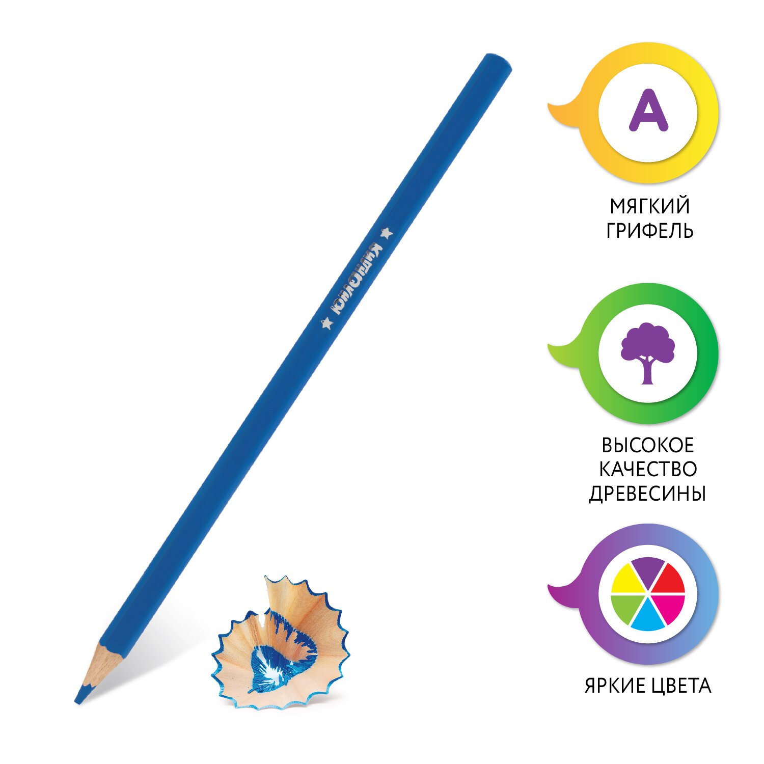 Набор состоит из 24 цветов: белый, каштановый, темно-коричневый, бежевый, малиновый, розовый, коричневый, коралловый, красный, персиковый, серый, оранжевый, канареечный, желтый, салатовый, светло-зеленый, бирюзовый, зеленый, темно-синий, темно-зеленый, синий, фиолетовый, сиреневый, черный. Яркие цвета развивают цветовосприятие ребенка. Шестигранная форма сечения корпуса позволяет не скатываться карандашу с поверхности стола во время занятий рисованием. Они изготовлены из древесины ценных пород и имеют лакированный корпус. Высокосортная древесина и качество исполнения гарантируют легкую заточку. Мягкий грифель качества "А" диаметром 3 мм обладает повышенной прочностью, не ломается и не крошится при заточке. Все карандаши заточены и поставляются в картонной упаковке с европодвесом.