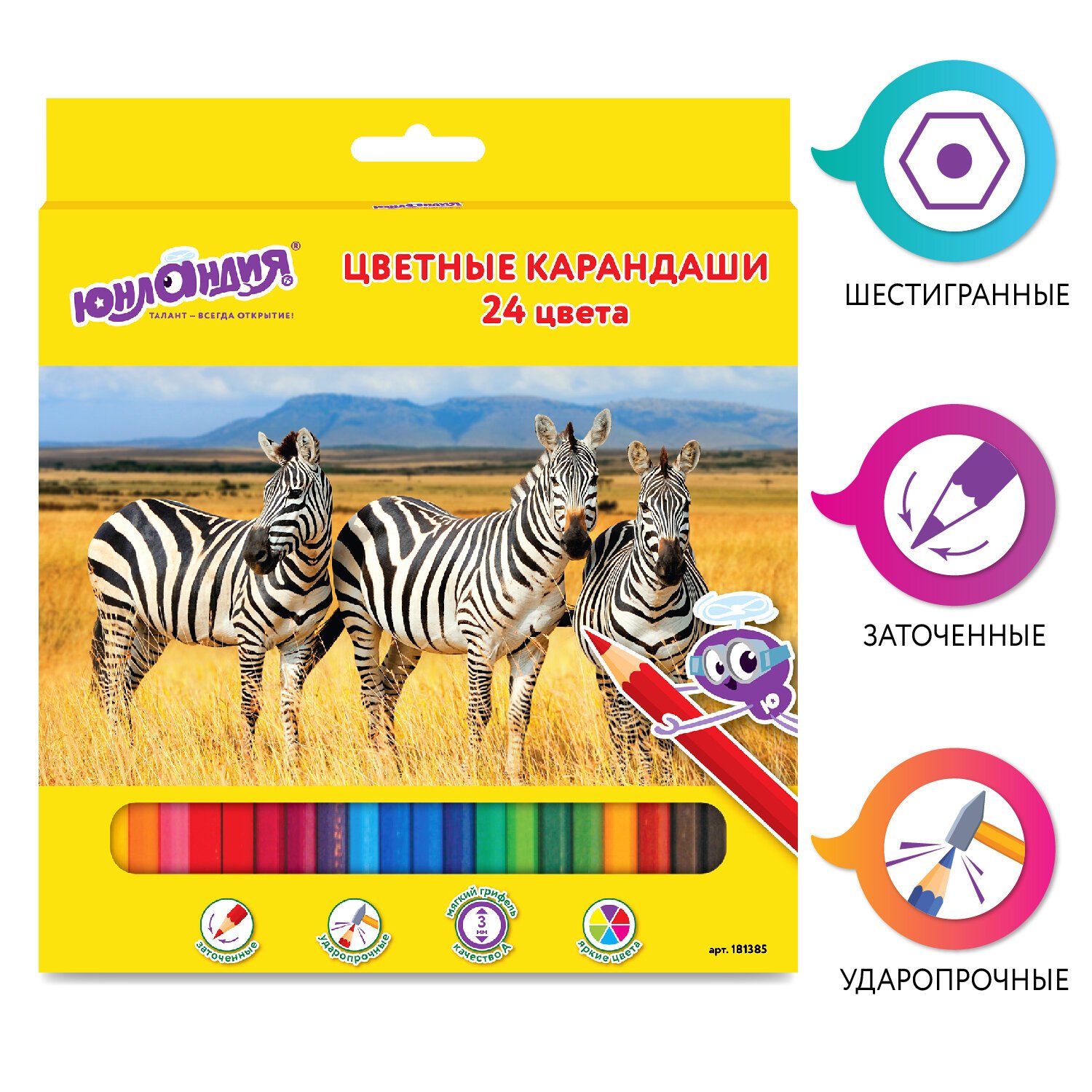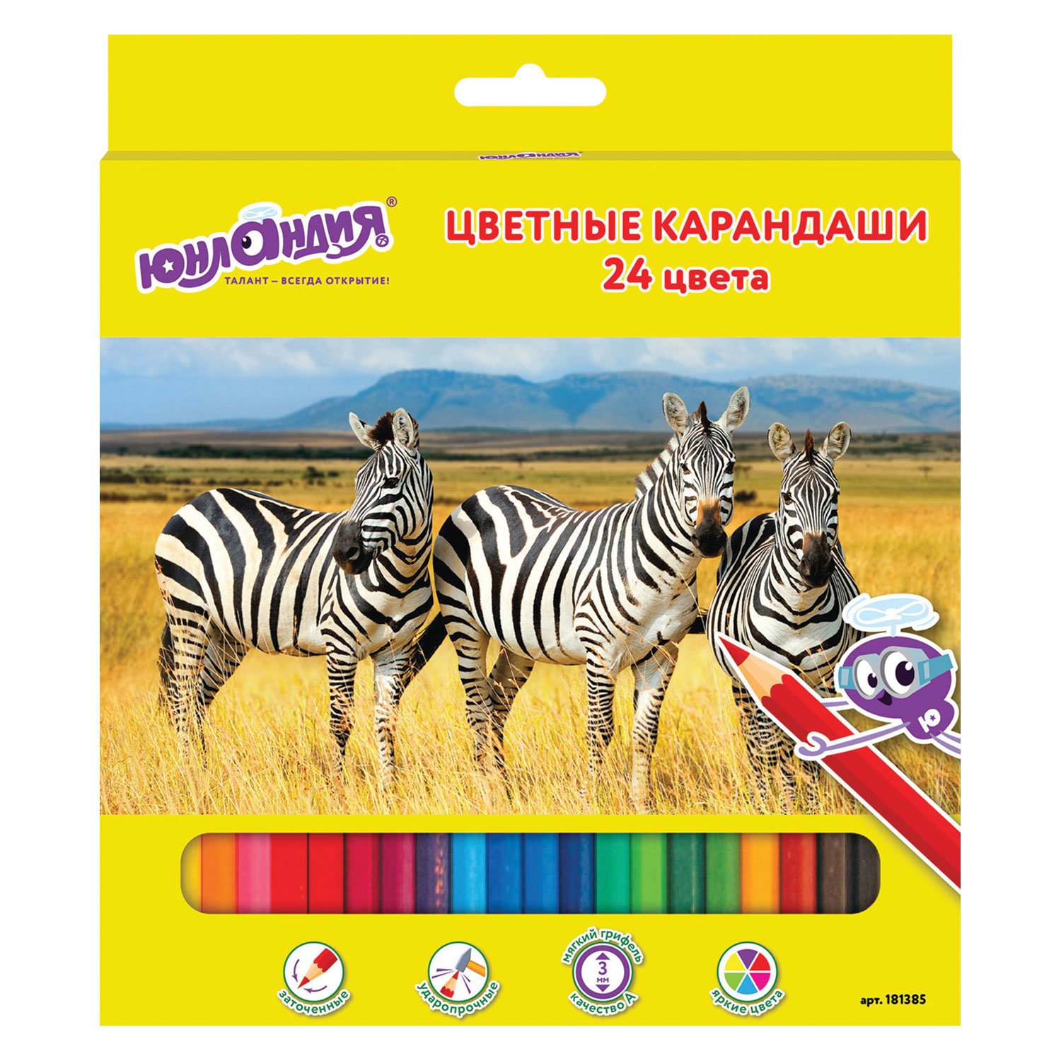 Карандаши цветные ЮНЛАНДИЯ "МИР ЖИВОТНЫХ", 24 цвета, шестигранные, грифель 3 мм, натуральное дерево, 181385