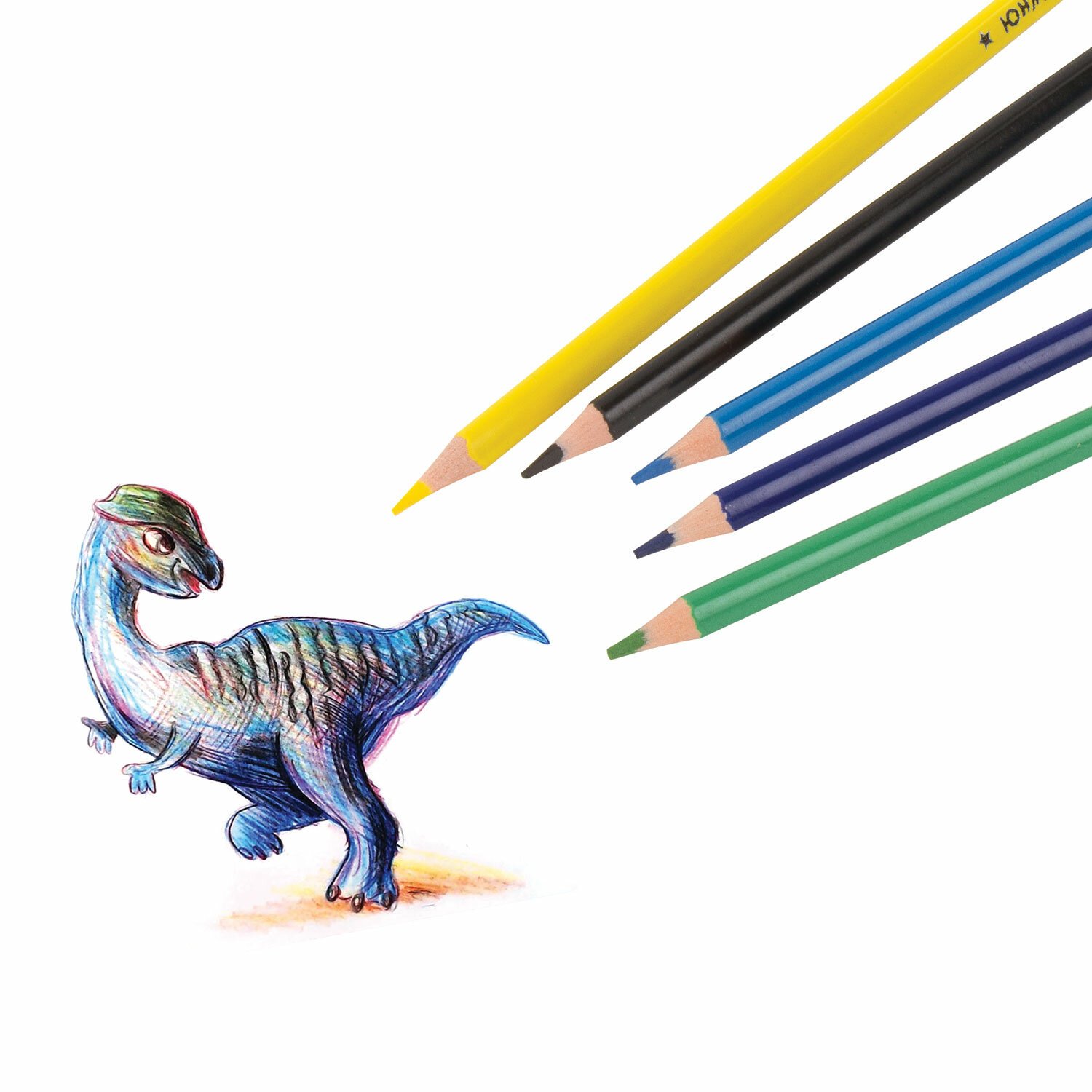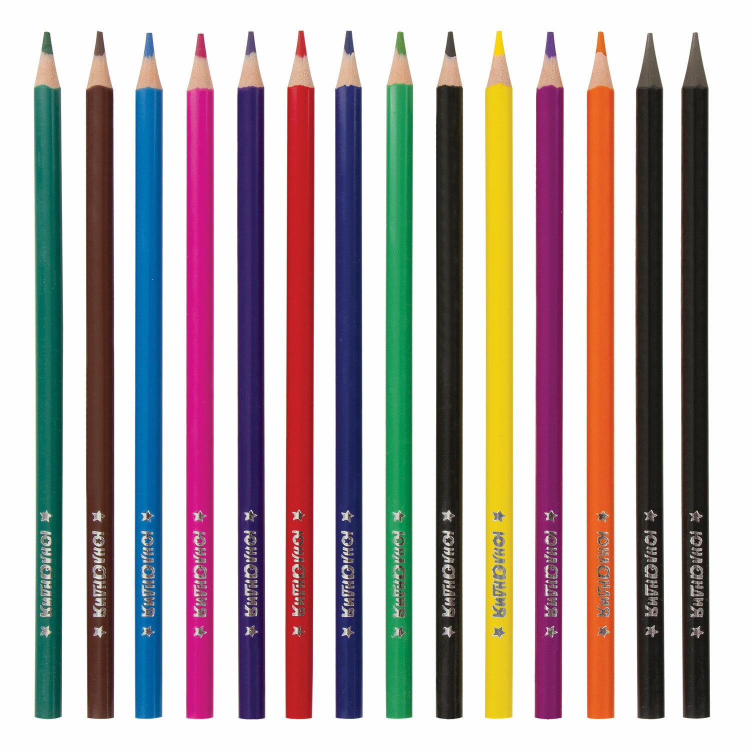 Набор состоит из 12 цветов: розовый, красный, желтый, оранжевый, салатовый, зеленый, голубой, синий, фиолетовый, коричневый, серый, черный и двух чернографитных карандаша. Трехгранная форма сечения корпуса позволяет карандашу не скатываться с поверхности стола во время занятий рисованием. Карандаши изготовлены из пластика и имеют лакированный корпус, который при разломе не образует острые края и безопасен для детей. Яркий мягкий грифель диаметром 3 мм обладает повышенной прочностью и легко затачивается. Все карандаши заточены, и поставляются в картонной упаковке с европодвесом.