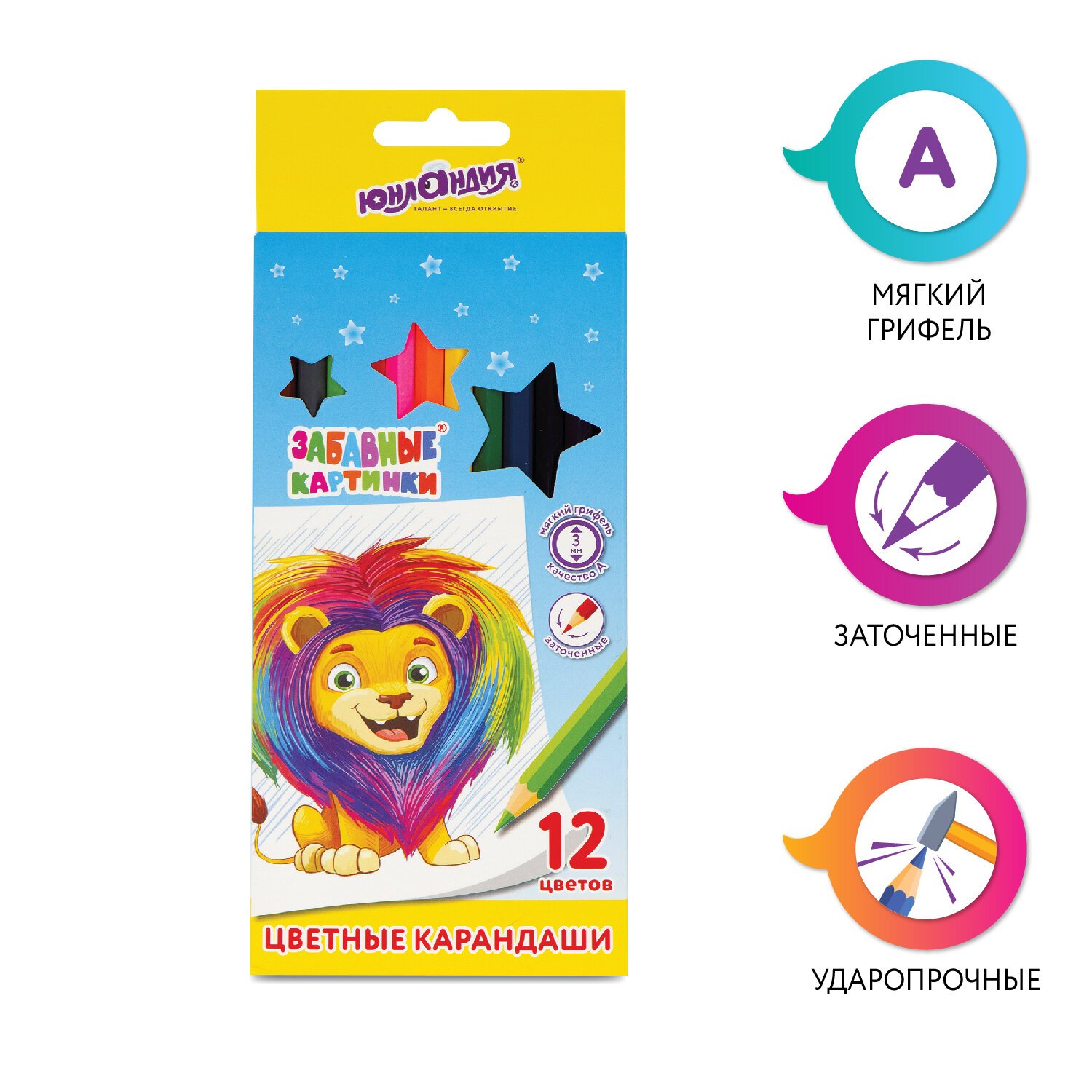 Карандаши цветные ЮНЛАНДИЯ "ЗАБАВНЫЕ КАРТИНКИ", 12 цветов, шестигранные, грифель 3 мм, натуральное дерево, 181643