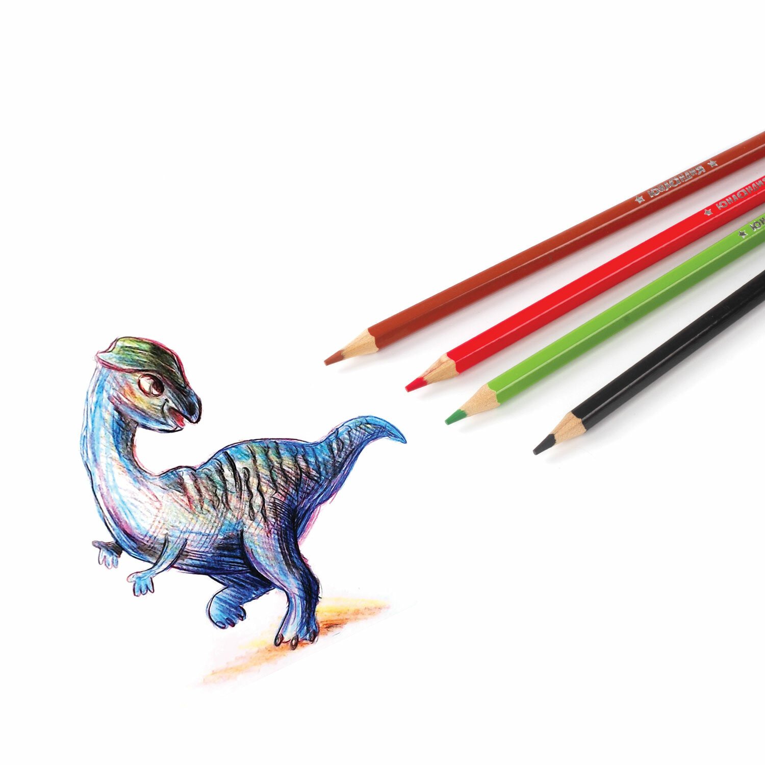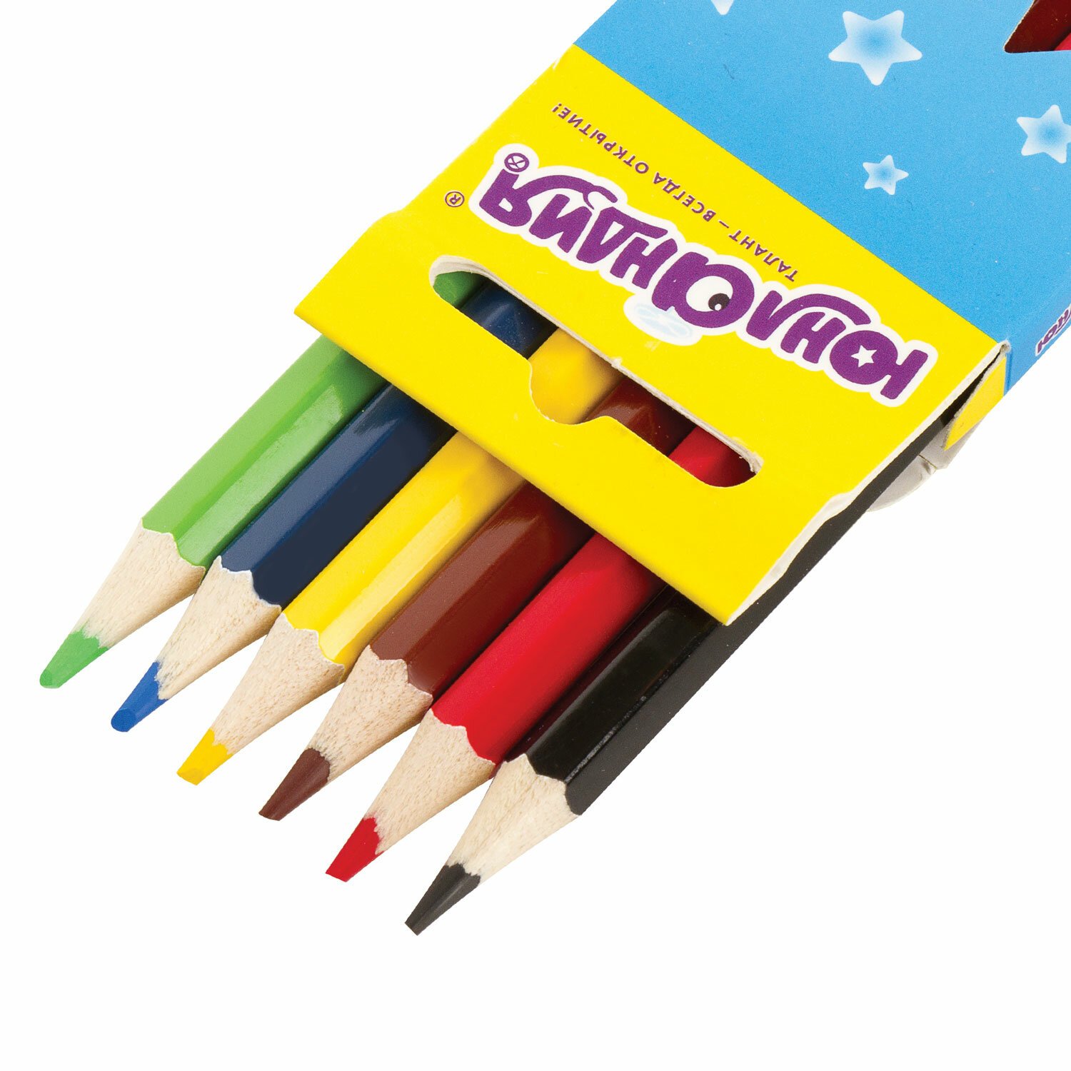 Набор состоит из 6 цветов: черный, голубой, зеленый, желтый, коричневый, красный. Яркие цвета развивают цветовосприятие ребенка. Шестигранная форма сечения корпуса позволяет не скатываться карандашам с поверхности стола во время занятий рисованием. Они изготовлены из древесины ценных пород и имеют лакированный корпус. Высокосортная древесина и качество исполнения гарантируют легкую заточку. Мягкий грифель качества "А" с диаметром 3 мм обладает повышенной прочностью, не ломается и не крошится при заточке. Все карандаши заточены и поставляются в картонной упаковке с европодвесом.