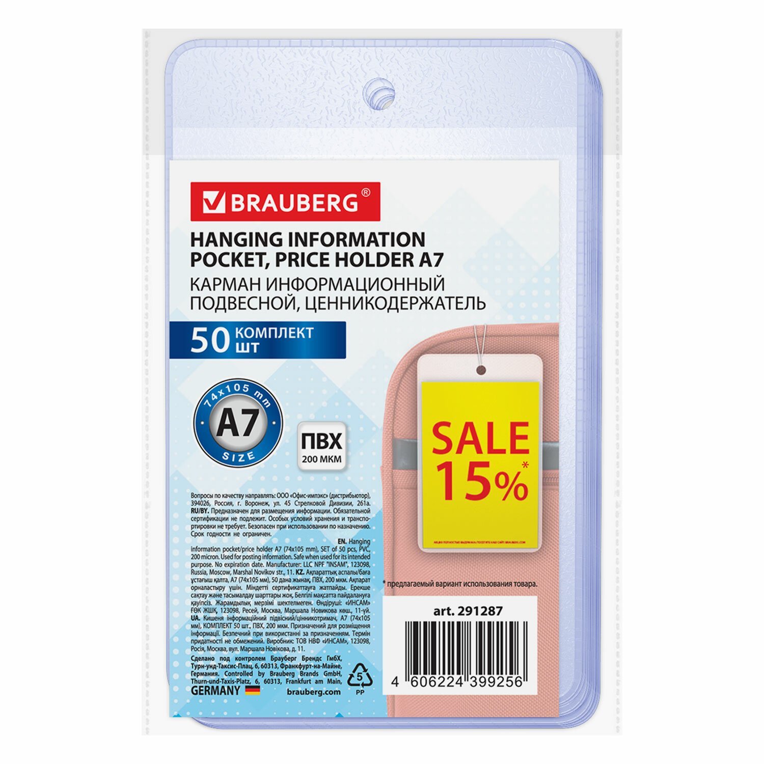 Карман информационный подвесной, ценникодержатель А7, КОМПЛЕКТ 50 шт., ПВХ, BRAUBERG, 291287
