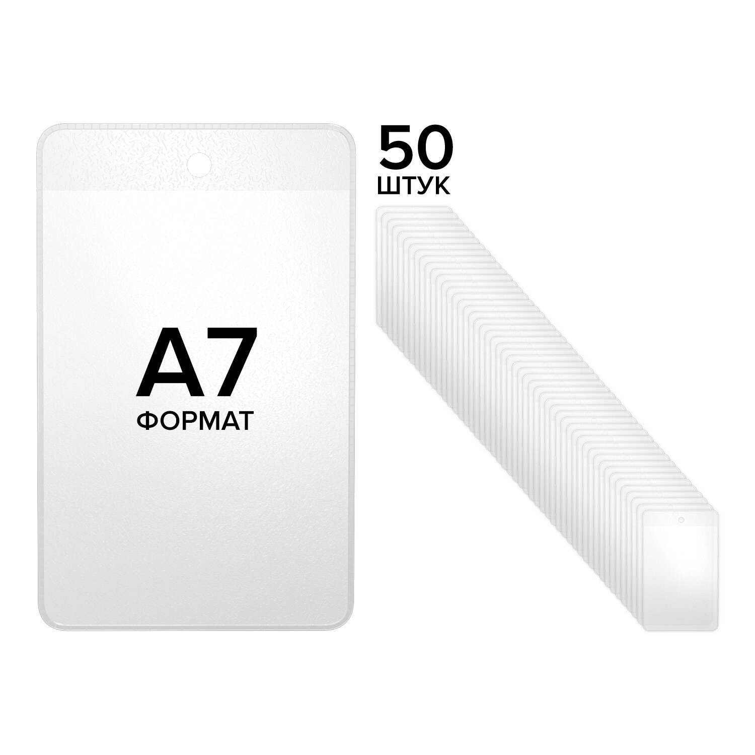 Карман имеет круглое отверстие для подвешивания ценника при помощи нейлоновых хомутов или веревочных биркодержателей. Предусматривает двустороннее размещение с верхней стороны. Формат: А7. Материал изготовления: мягкий ПВХ. Размер одного кармана: 8,1х11,4х0,1 см. Единица продажи: 50 шт., упакованные в пакет с липким краем.