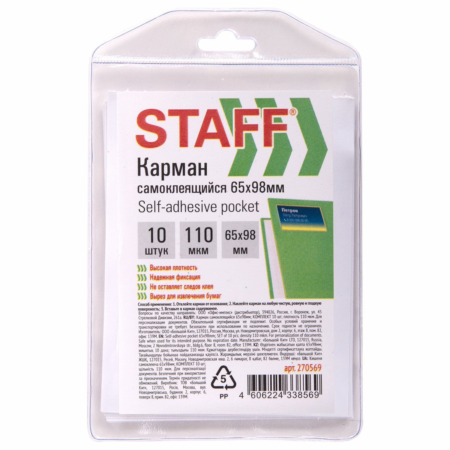 Карманы самоклеящиеся для визиток и персонализации 65х98 мм, КОМПЛЕКТ 10 шт., STAFF, 270569