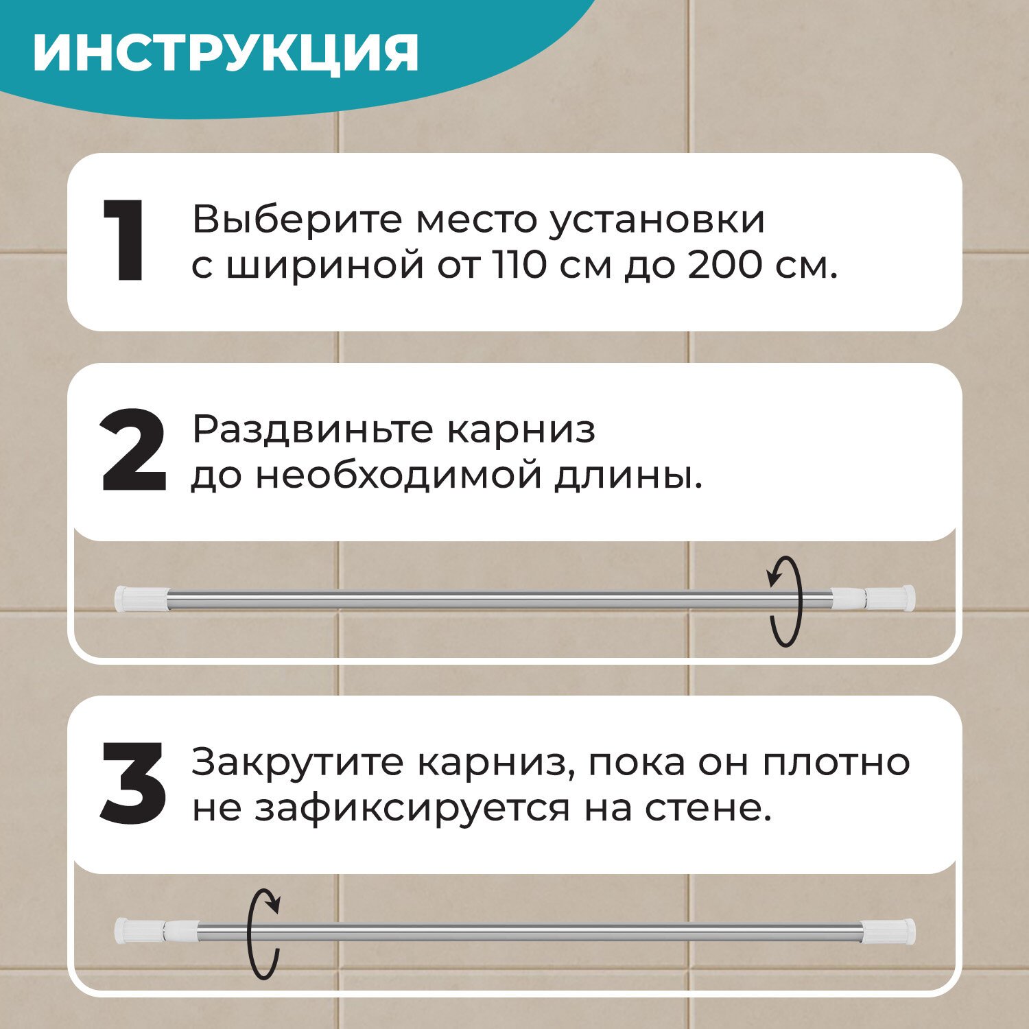 Надежность и долговечность карниза обеспечены высококачественной нержавеющей сталью. Универсальная длина от 110 до 200 сантиметров позволяет идеально вписать карниз в любой интерьер. Карниз надежно фиксируется между стенами и не требует сложного крепления. Установка займет всего несколько минут.