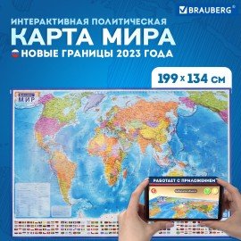 Карта мира политическая 199х134 см, 1:15,5М, с ламинацией, интерактивная, европодвес, BRAUBERG, 112387