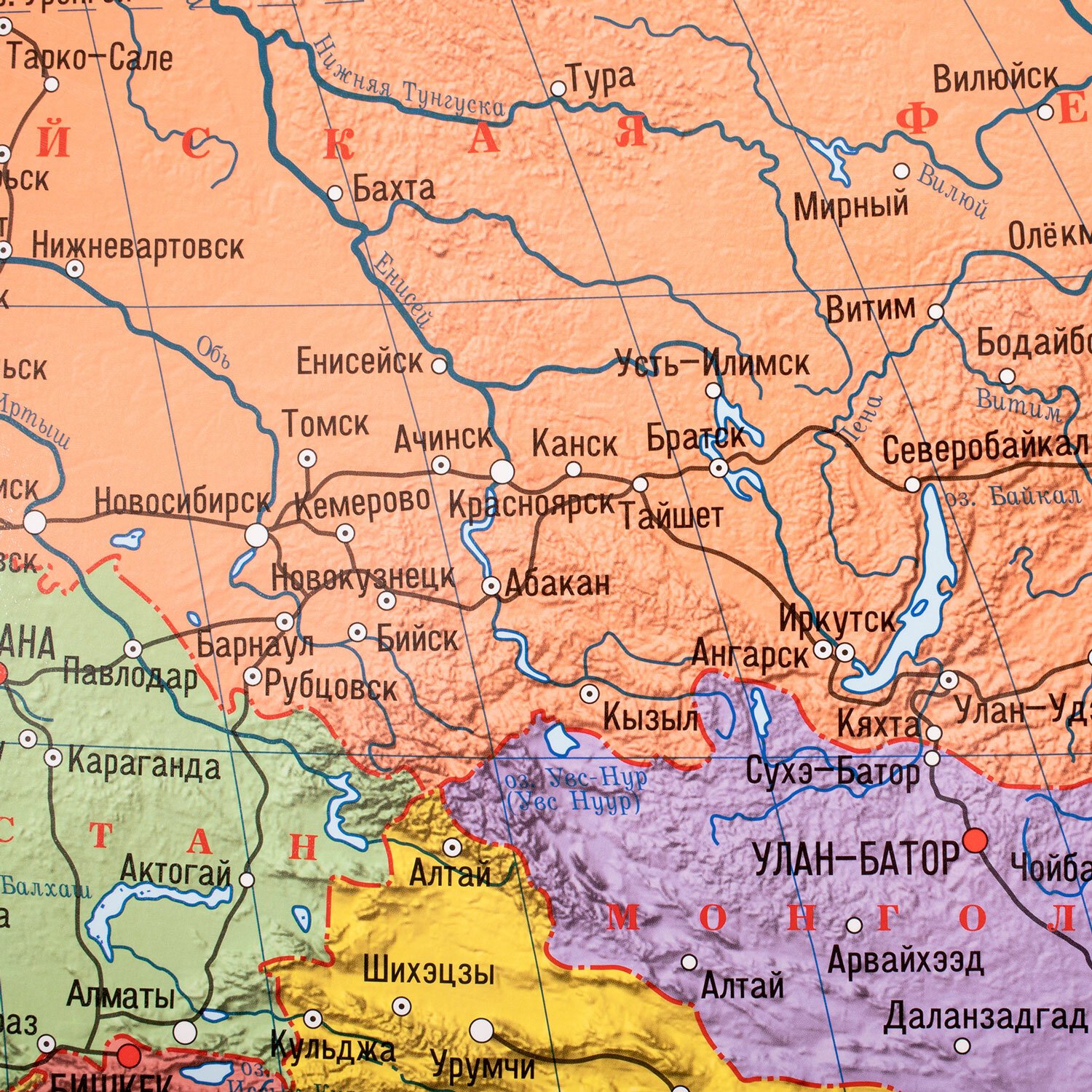 Настенная карта мира с масштабом 1:15 500 000 обладает размером 199х134 см. Выполнена из ламинированного картона плотностью 170 г/м2. Поставляется в упаковке с европодвесом.