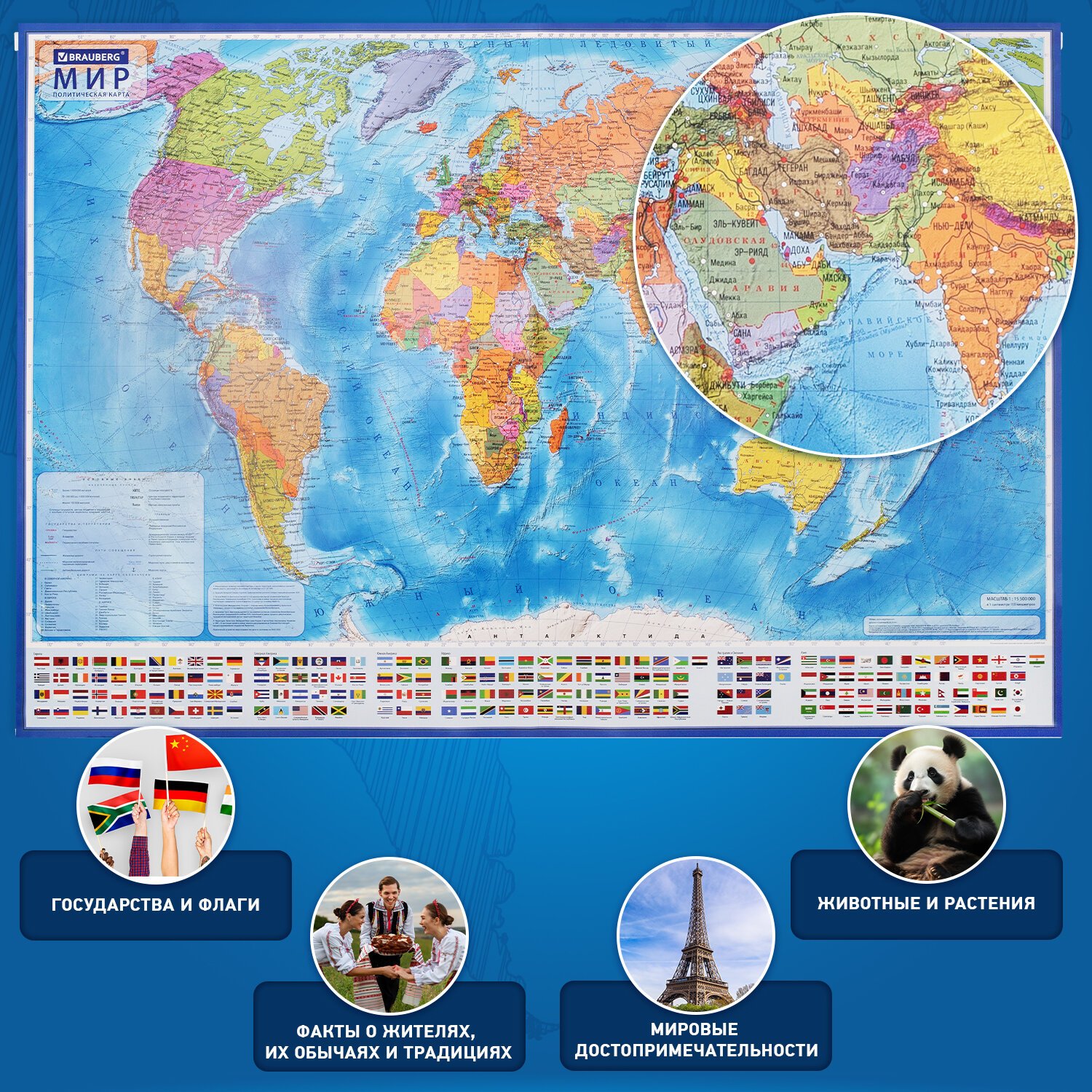 Карта мира политическая 157х107см, 1:21,5М, с ламинацией, интерактивная, европодвес, BRAUBERG, 112386