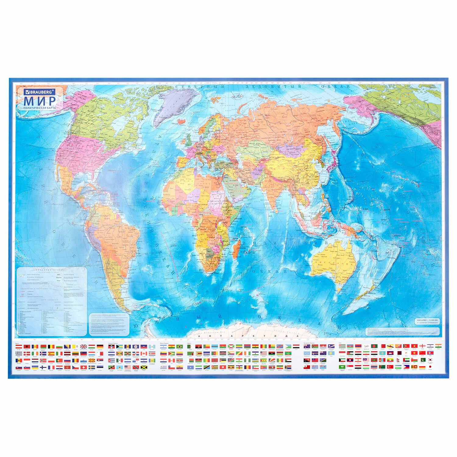 На политической карте мира BRAUBERG отображается современное политико-административное устройство мира: названия государств и их столицы, крупнейшие города и границы стран. Ниже расположены государственные флаги.