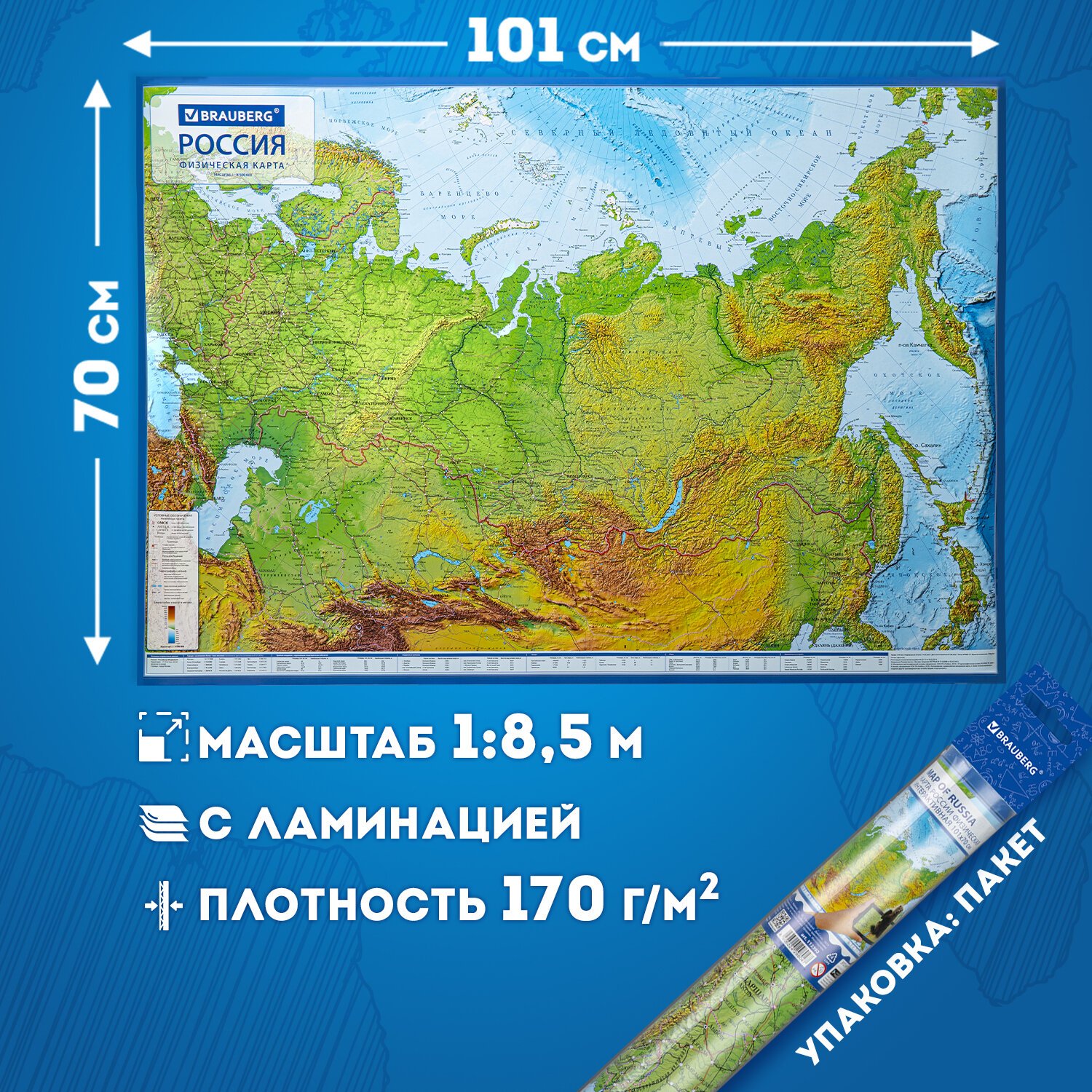Карта России физическая 101х70 см, 1:8,5М, с ламинацией, интерактивная, европодвес, BRAUBERG, 112392
