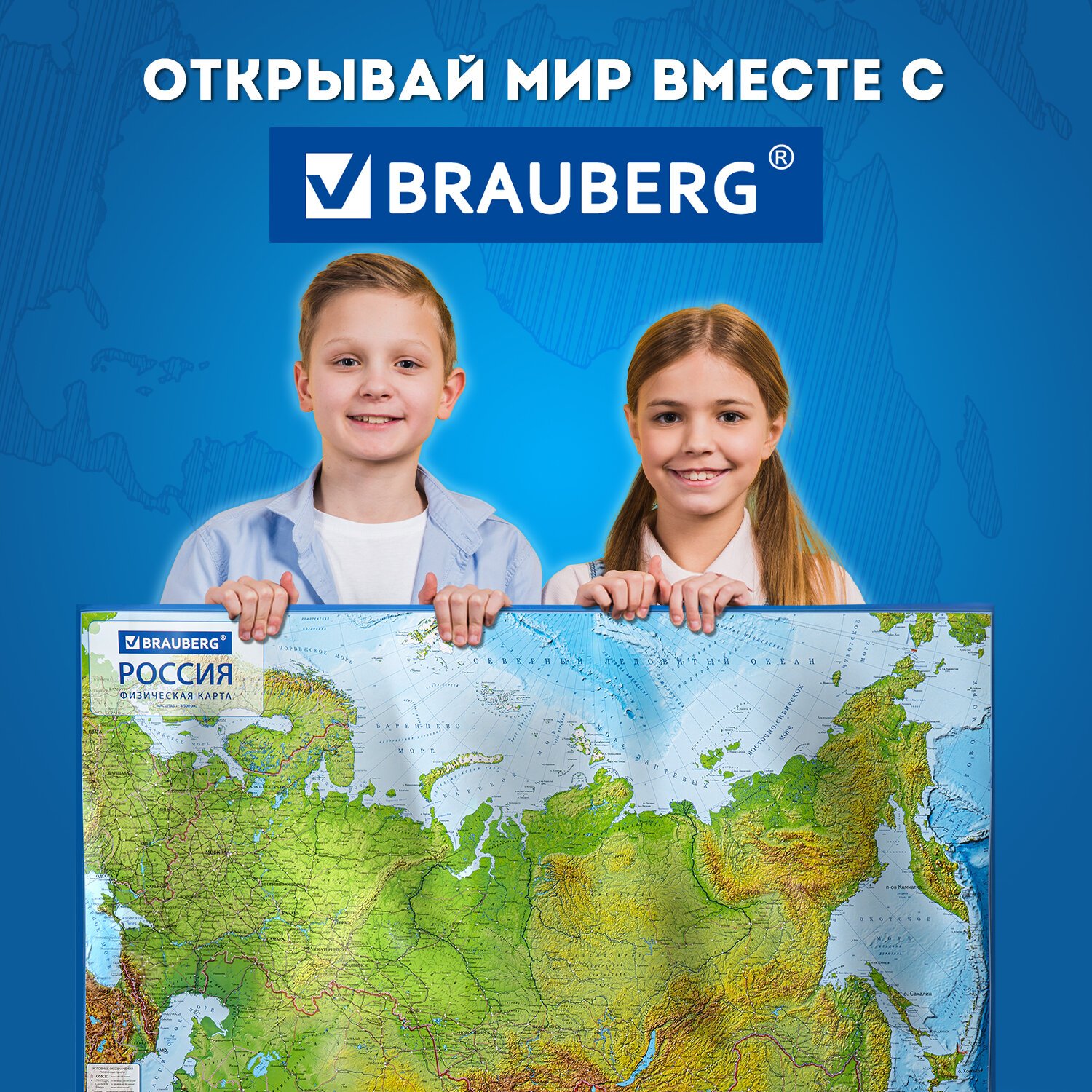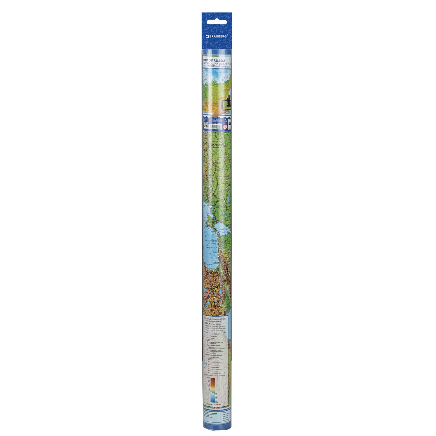 Карта России физическая 116х80 см, 1:7,5М, с ламинацией, интерактивная, в тубусе, BRAUBERG, 112394