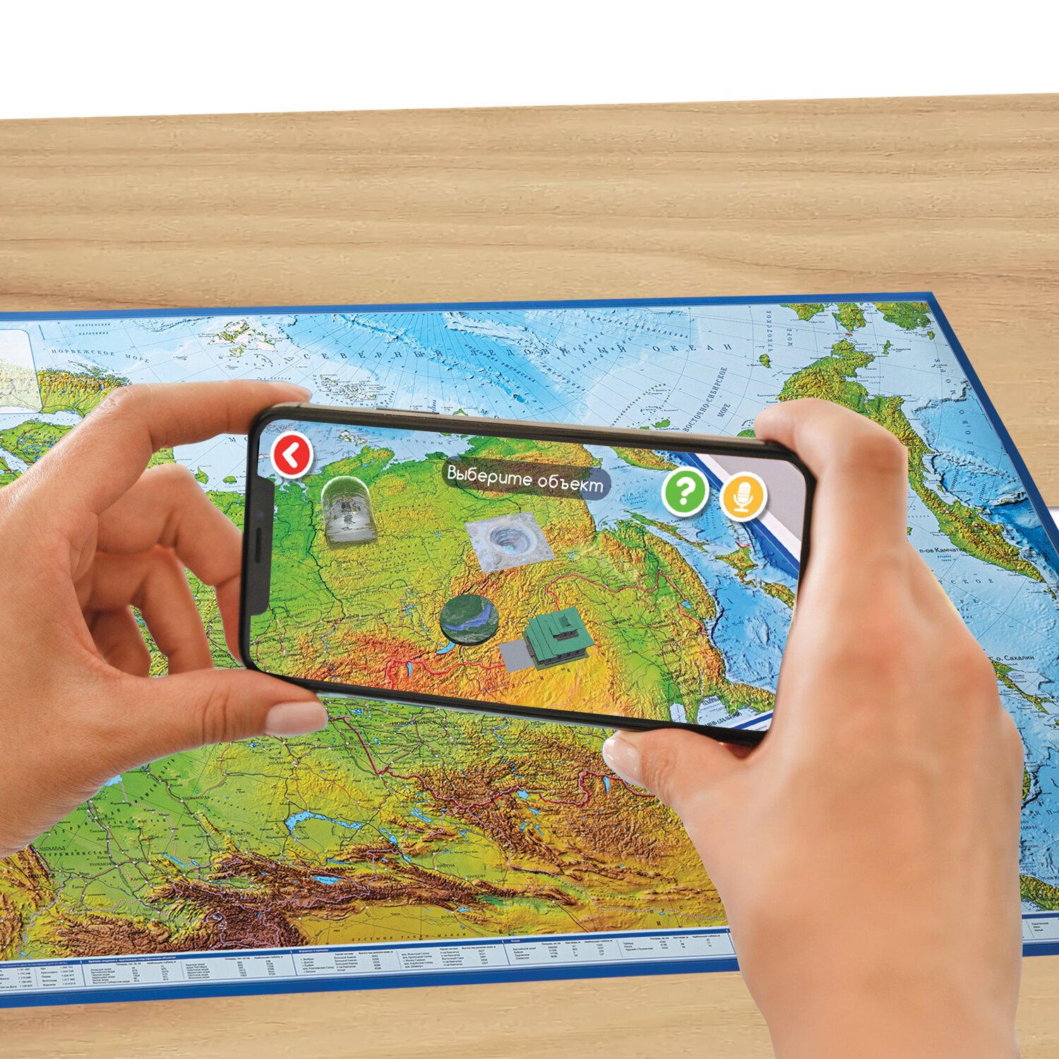 Скачайте приложение IQ Globen на IOS или Android, в главном меню выберите "Карты", откройте карту России и наведите камеру. Эффект дополненной реальности не заставит себя ждать. Герои приложения помогут вам в изучении России.