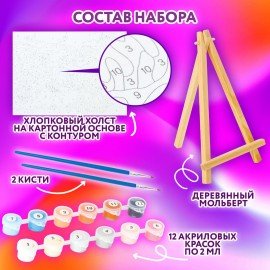 В набор входит: 1 хлопковый холст на картонной основе с контуром, 12 акриловых красок объемом 2 мл каждая 2 синтетические кисти и деревянный мольберт.