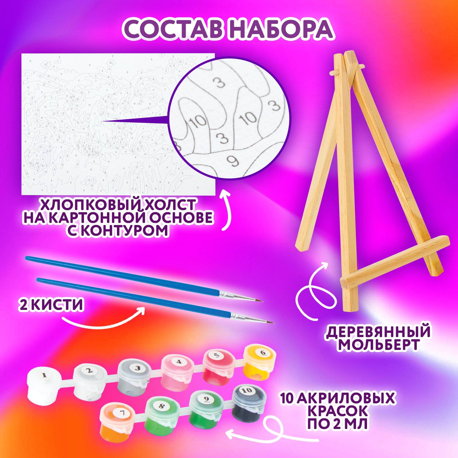 В набор входит: 1 хлопковый холст на картонной основе с контуром, 10 акриловых красок объемом 2 мл каждая 2 синтетические кисти и деревянный мольберт.