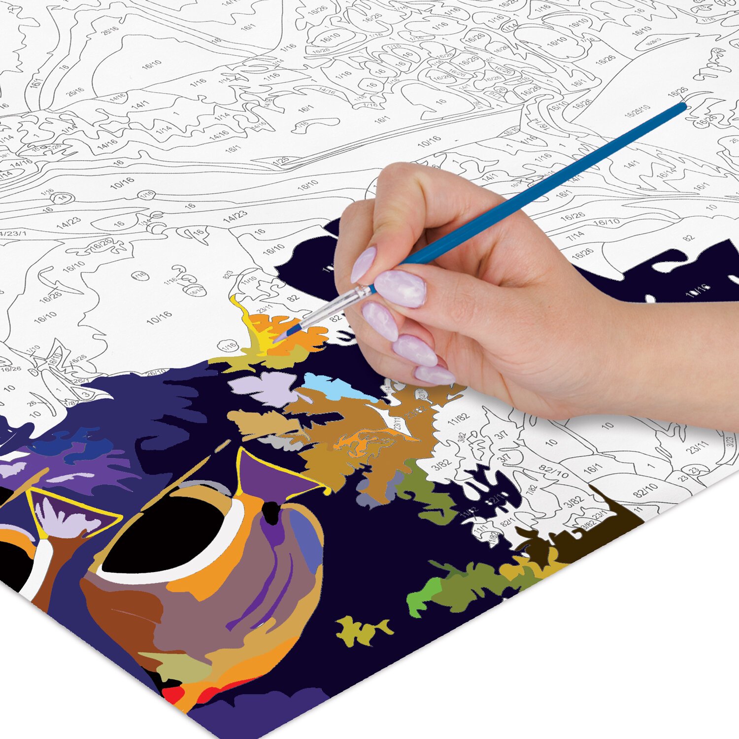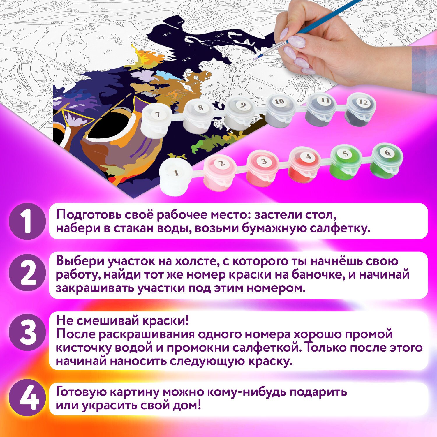 Краски укрывистые, быстро сохнут без потери цвета. Каждый цвет в наборе подходит под конкретный номер, благодаря чему нет необходимости смешивать краски. Однако, если Вы хотите добиться нового оттенка, наши краски с легкостью позволят это сделать, благодаря отличной смешиваемости.