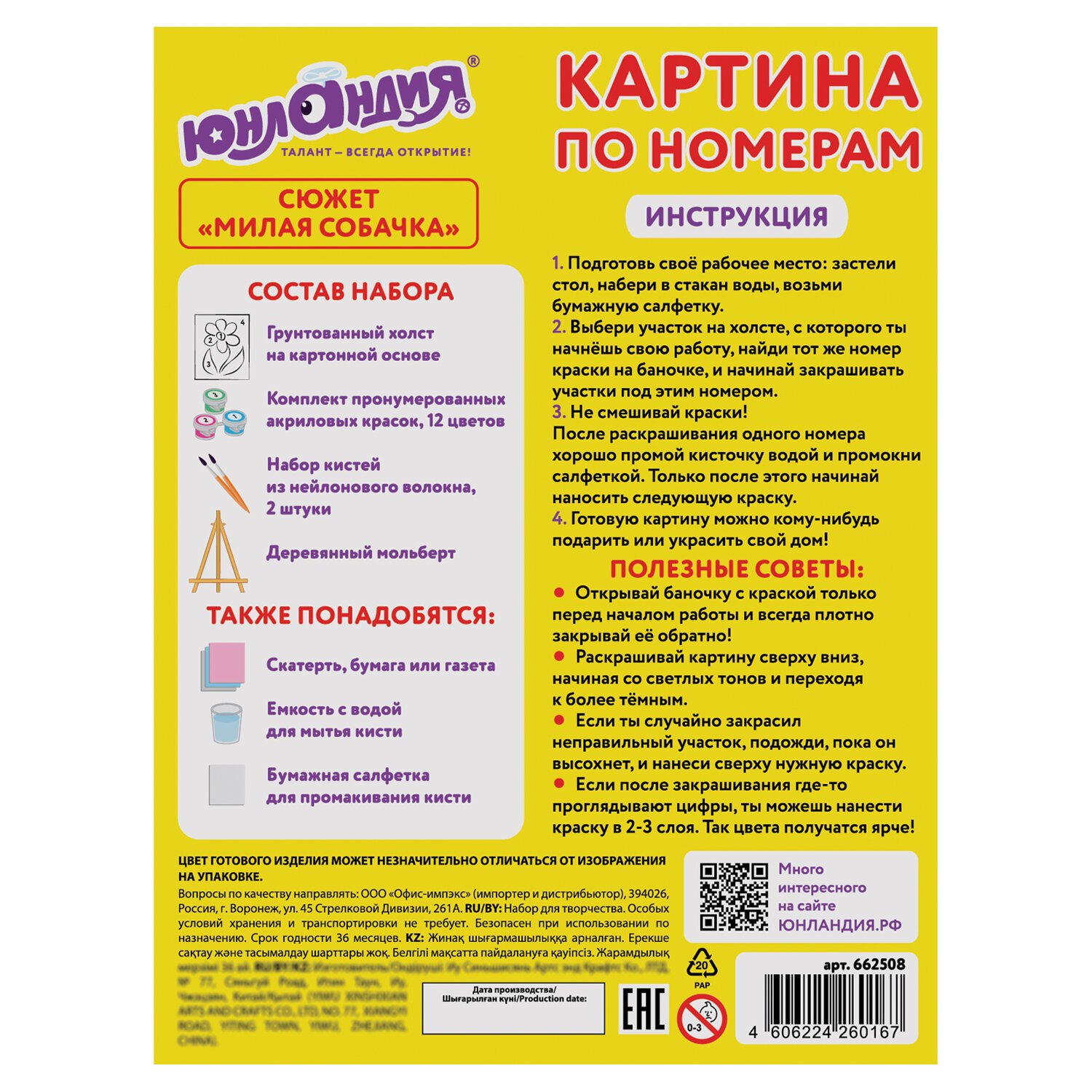 В набор входит: 1 хлопковый холст на картонной основе с контуром, 12 акриловых красок объемом 2 мл каждая 2 синтетические кисти и деревянный мольберт.