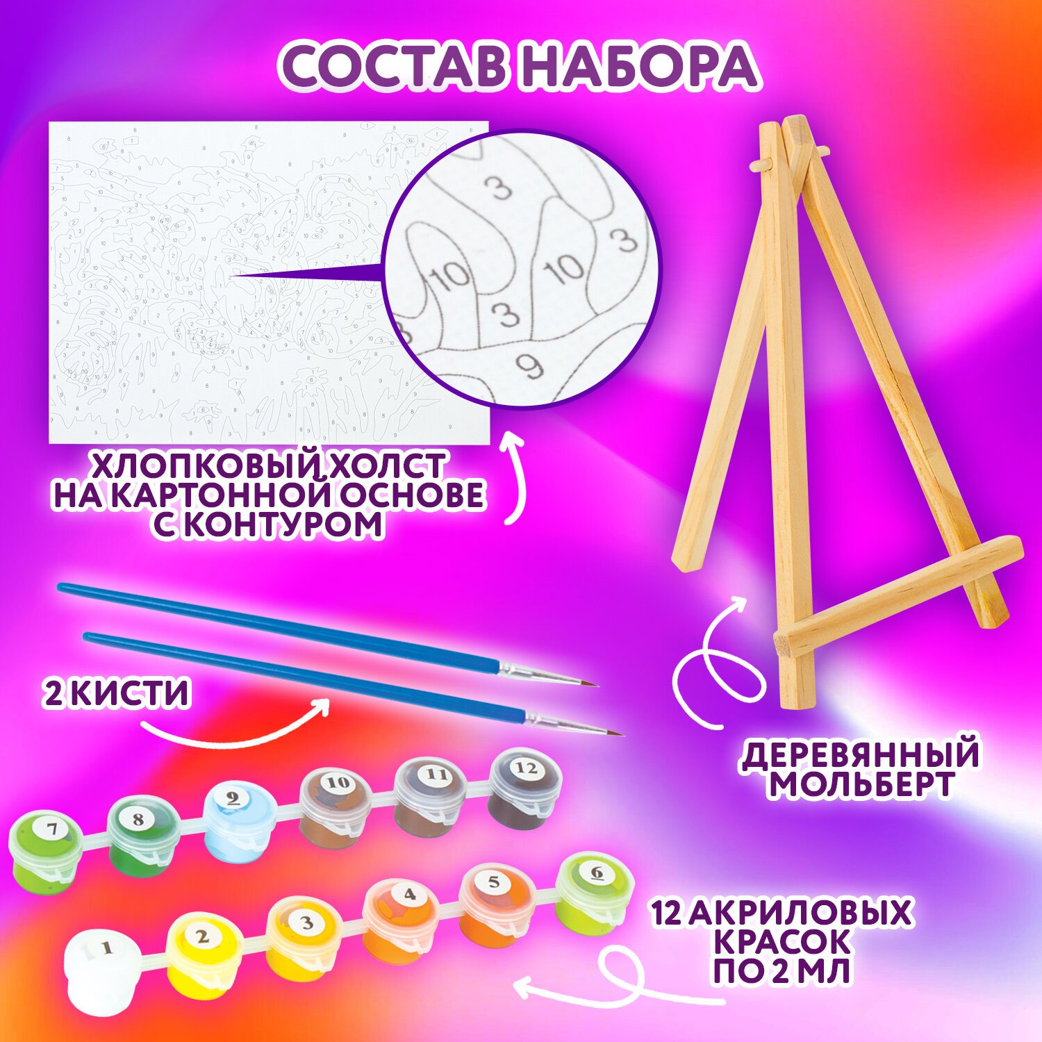 В набор входит: 1 хлопковый холст на картонной основе с контуром, 12 акриловых красок объемом 2 мл каждая 2 синтетические кисти и деревянный мольберт.