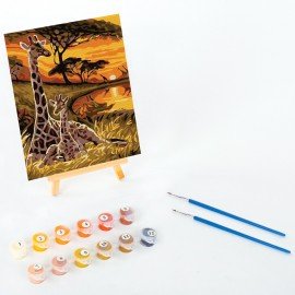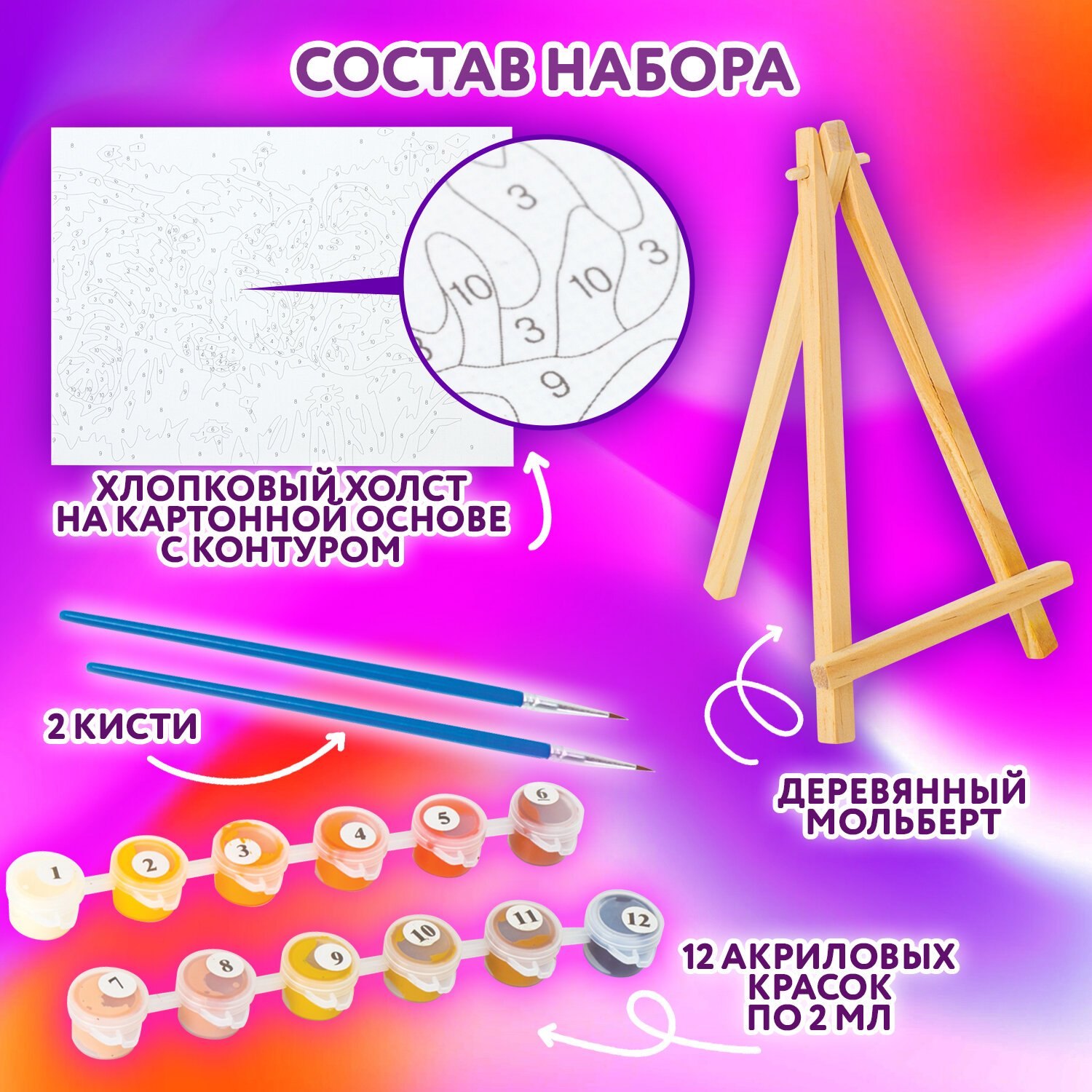 В набор входит: 1 хлопковый холст на картонной основе с контуром, 12 акриловых красок объемом 2 мл каждая 2 синтетические кисти и деревянный мольберт.