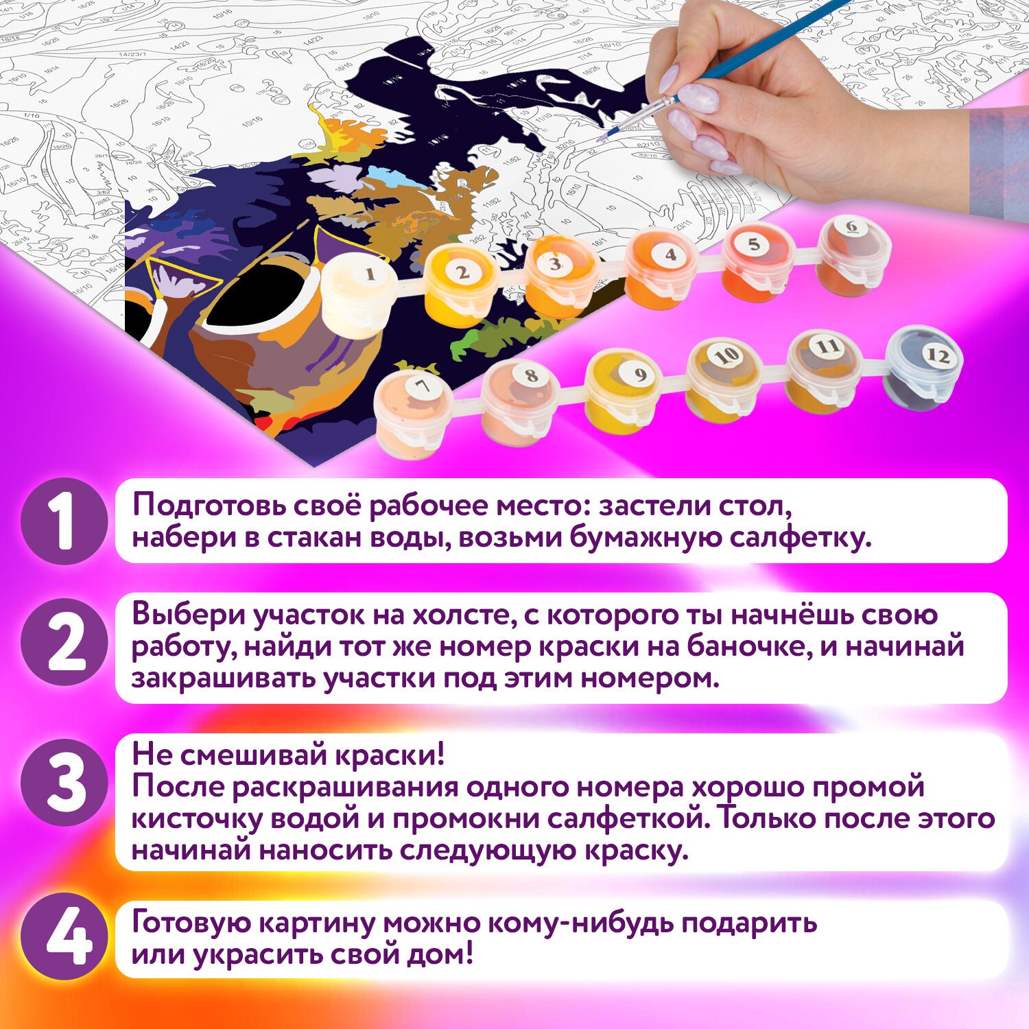 При работе с картиной дополнительно могут понадобиться: емкость с водой для мытья кисти и салфетка для удаления воды с кисти (В КОМПЛЕКТ НЕ ВХОДЯТ).
