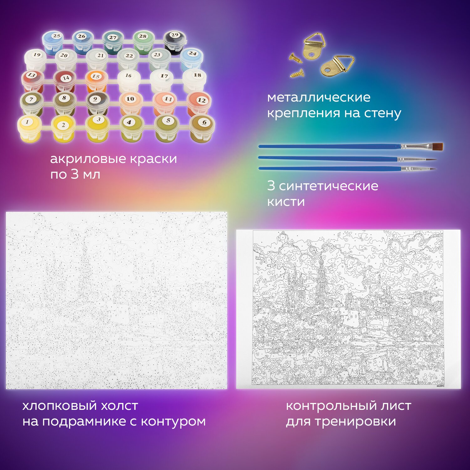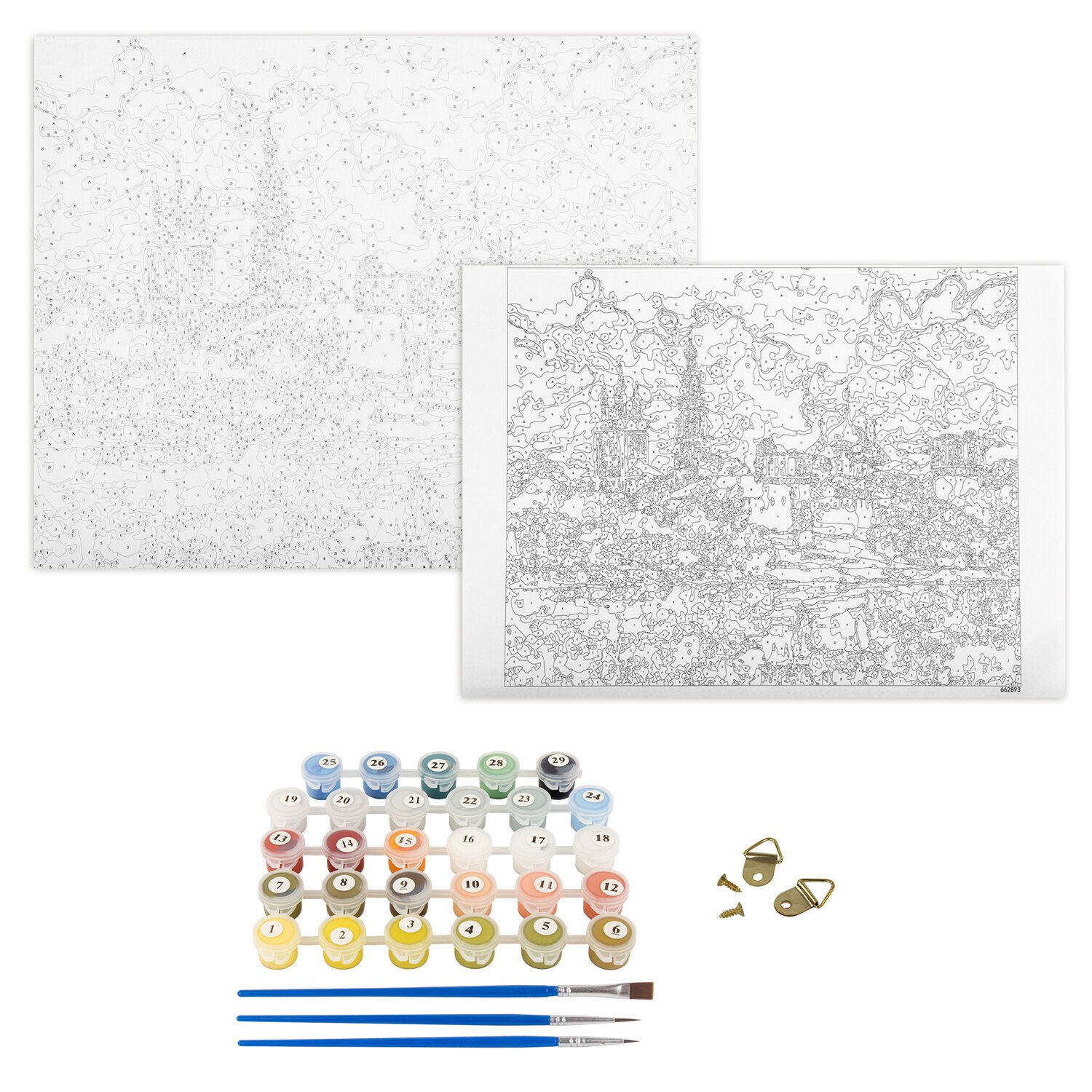 В набор входит: 1 хлопковый холст на подрамнике с контуром, 1 лист бумаги для тренировки, набор из 29 акриловых красок объемом 3 мл каждая, 3 синтетические кисти и комплект металлических креплений для подвешивания на стену.