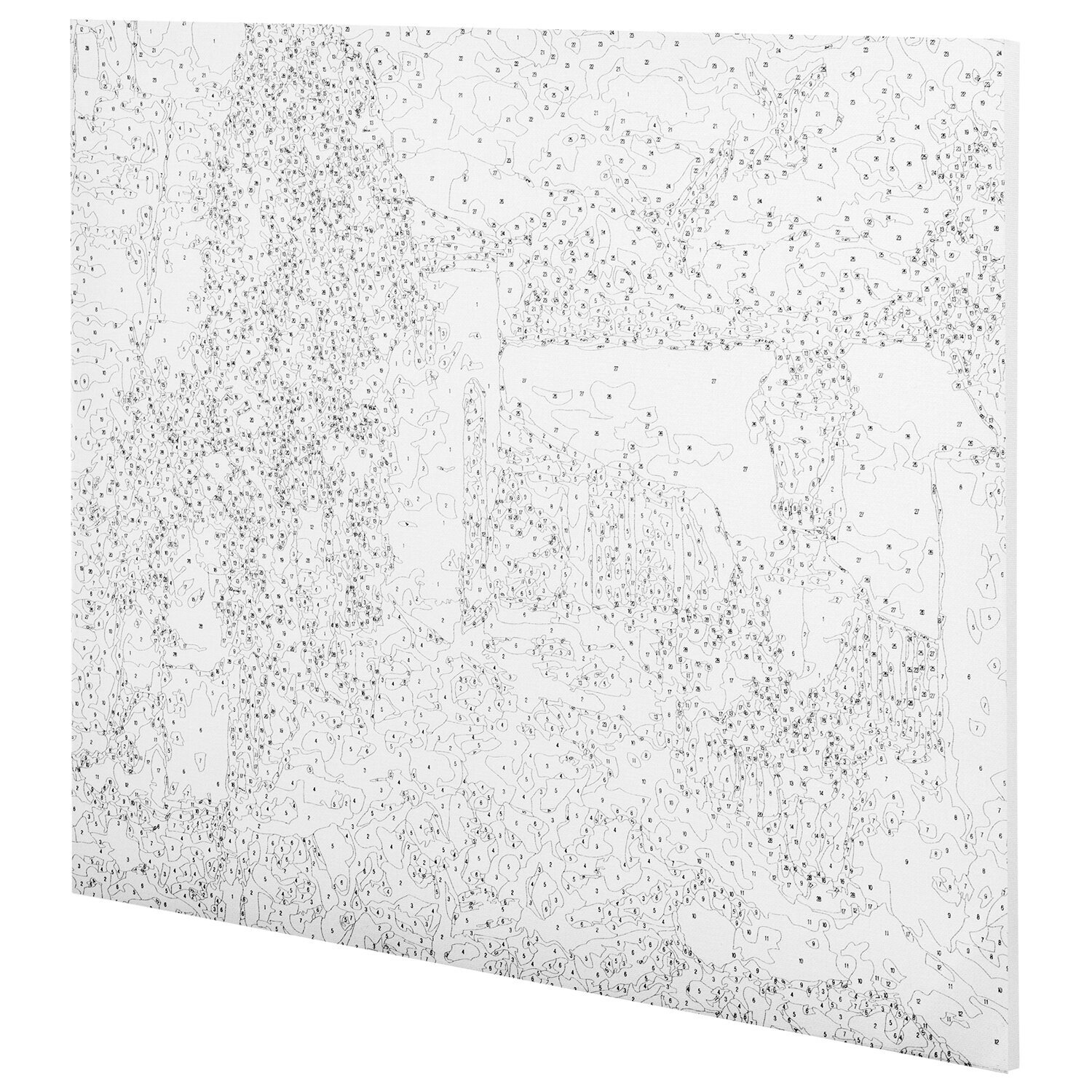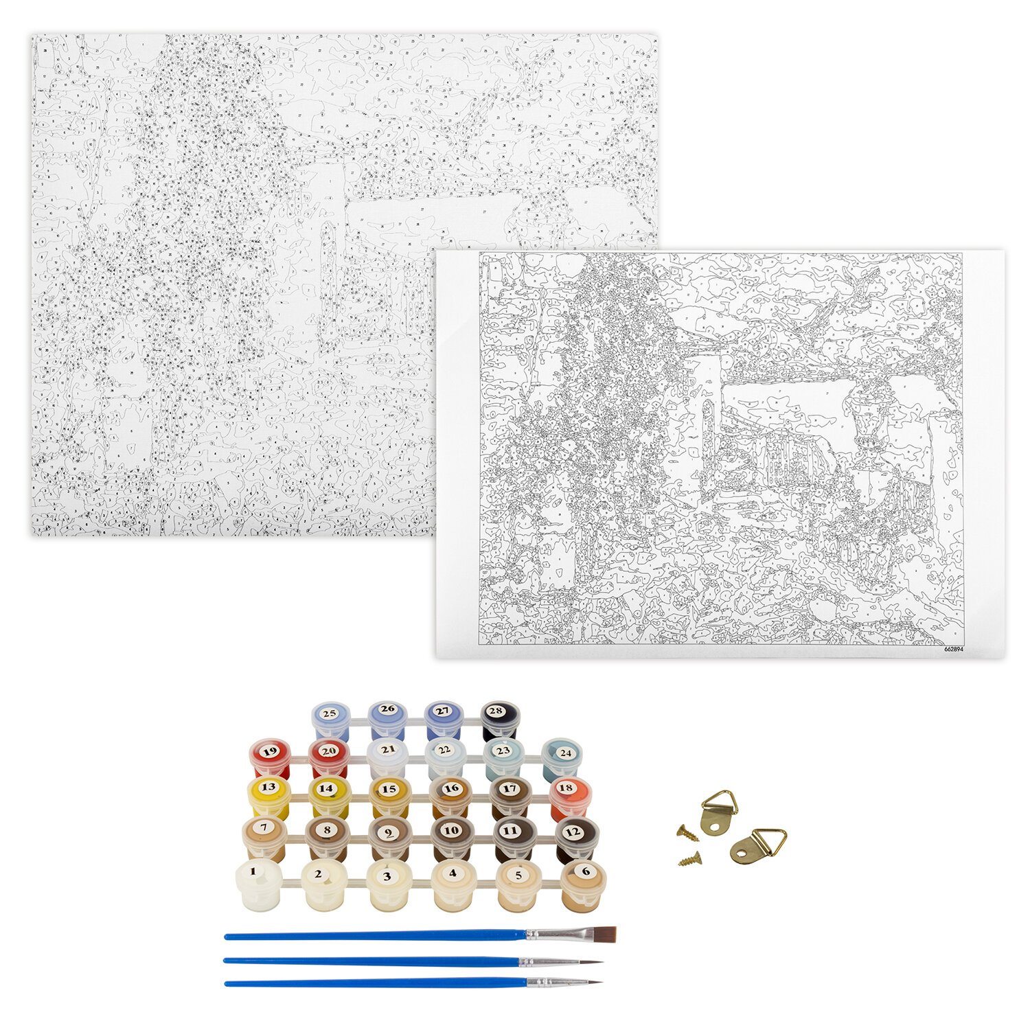 В набор входит: 1 хлопковый холст на подрамнике с контуром, 1 лист бумаги для тренировки, набор из 28 акриловых красок объемом 3 мл каждая, 3 синтетические кисти и комплект металлических креплений для подвешивания на стену.