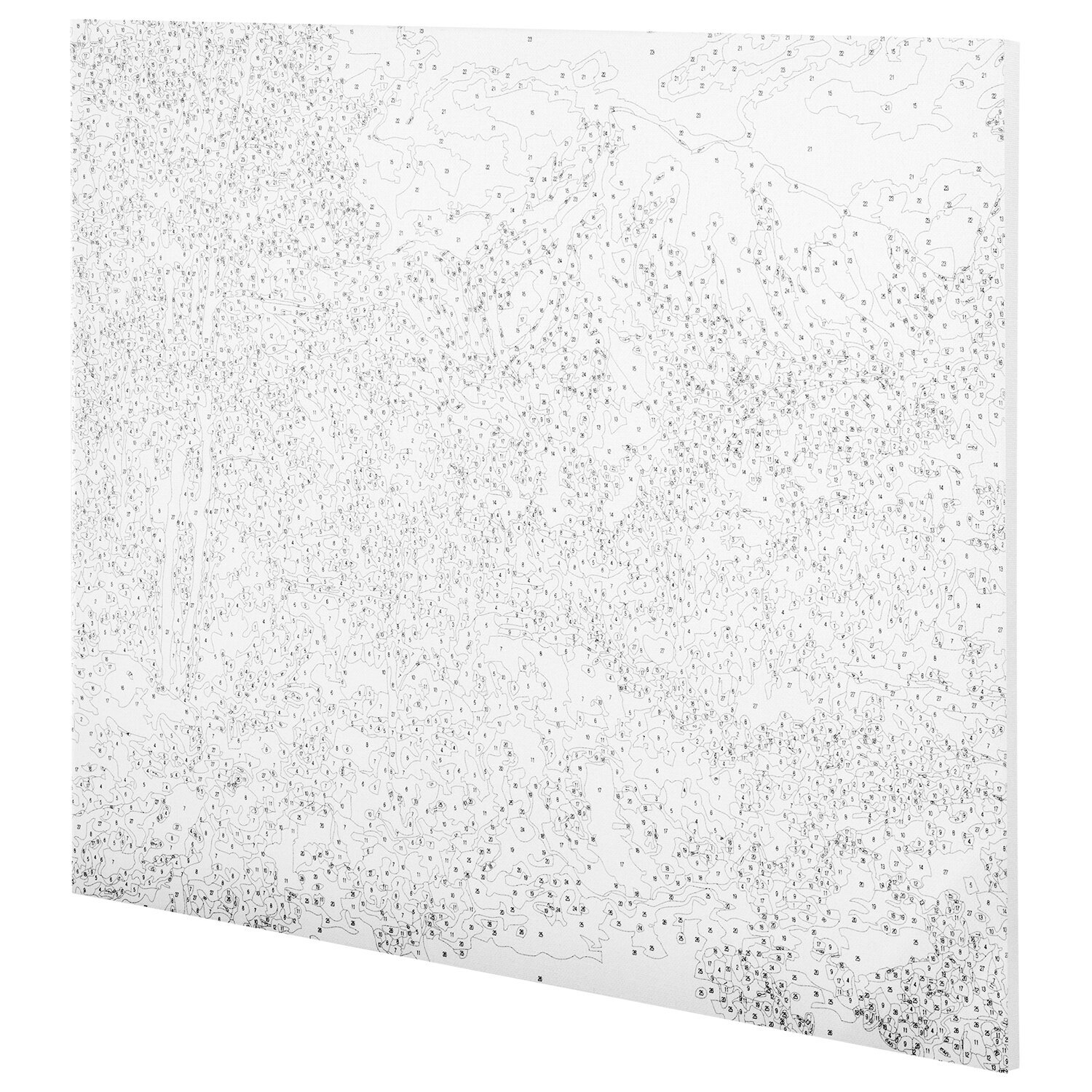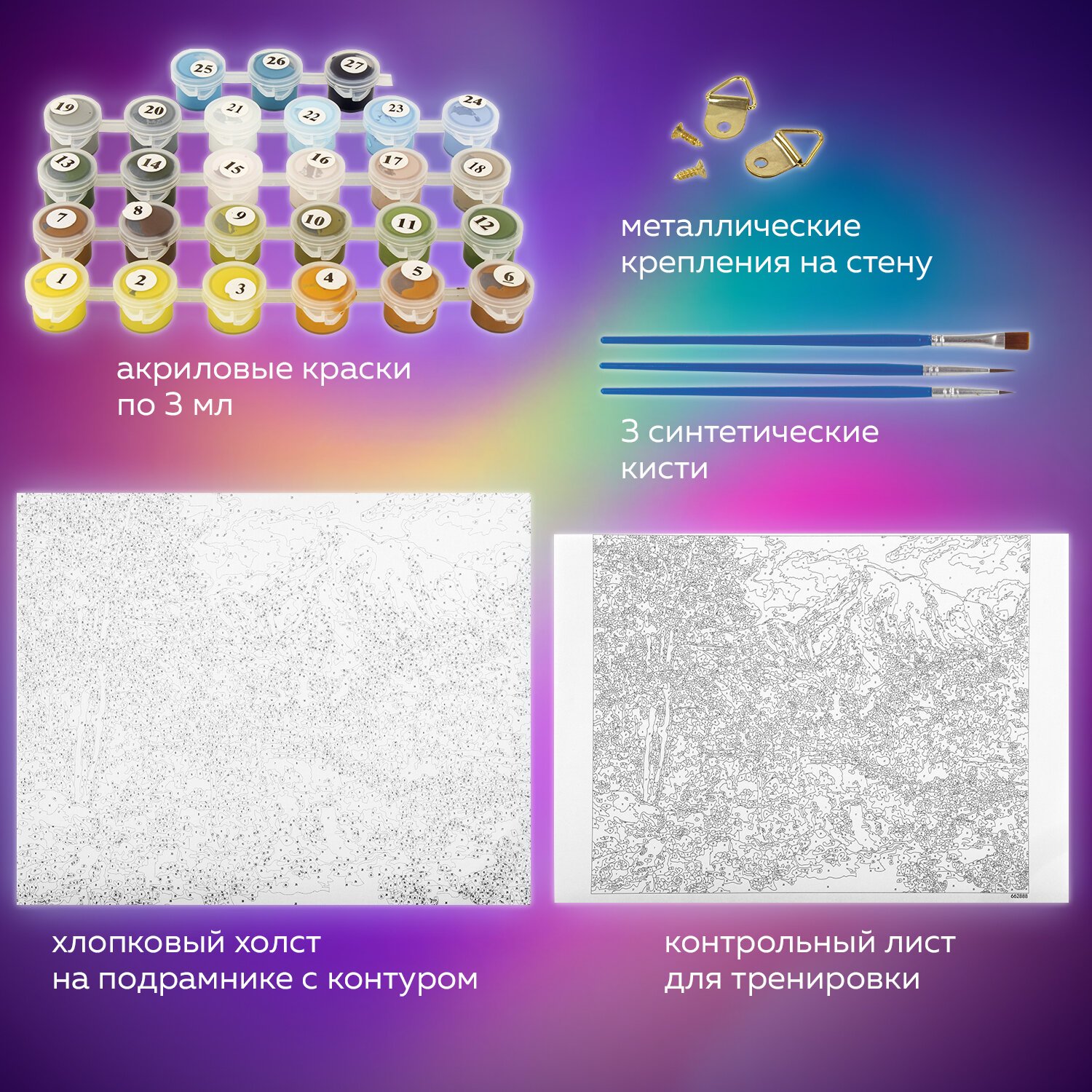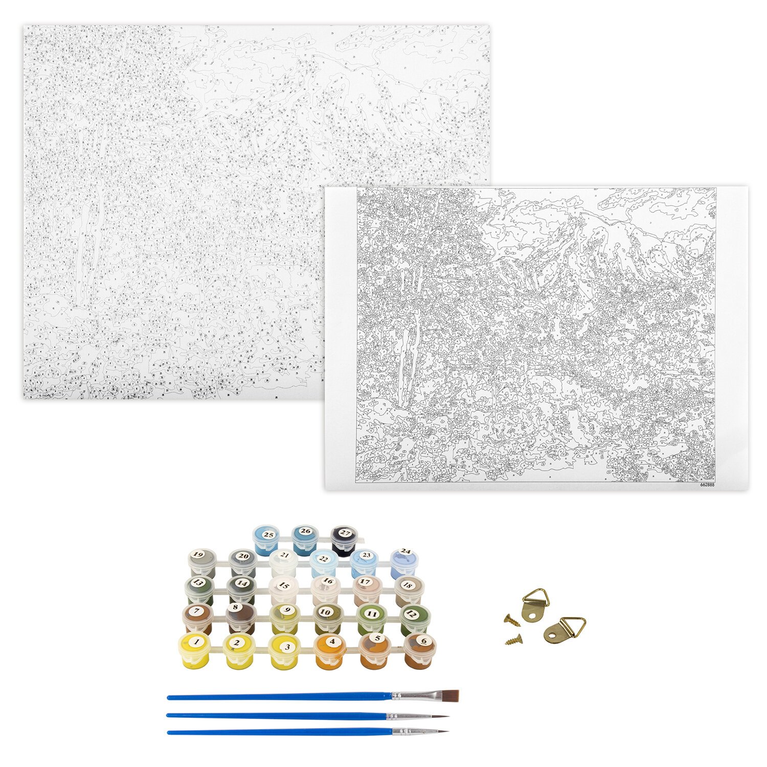 В набор входит: 1 хлопковый холст на подрамнике с контуром, 1 лист бумаги для тренировки, набор из 27 акриловых красок объемом 3 мл каждая, 3 синтетические кисти и комплект металлических креплений для подвешивания на стену.