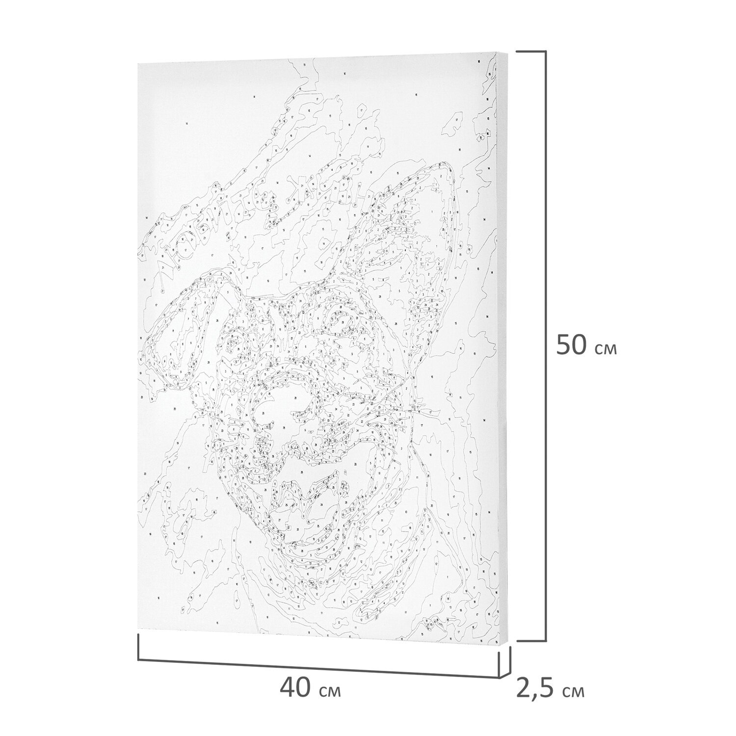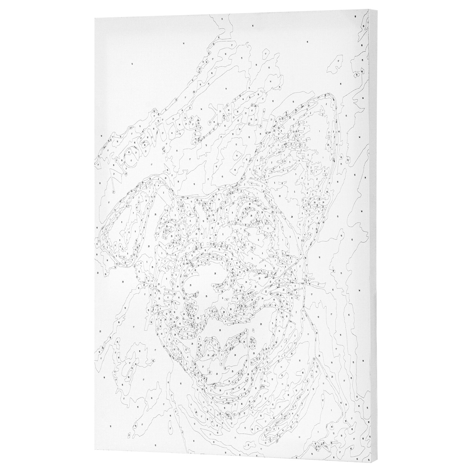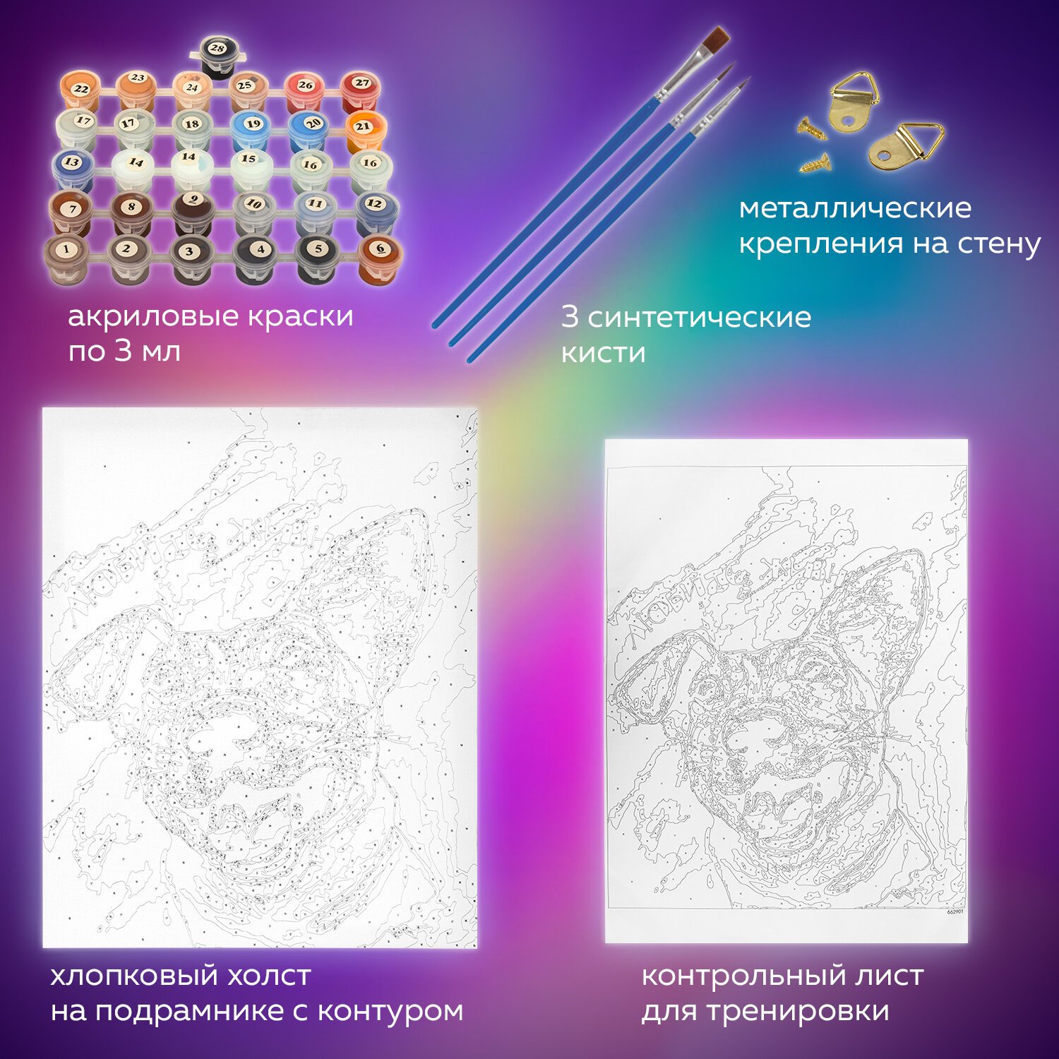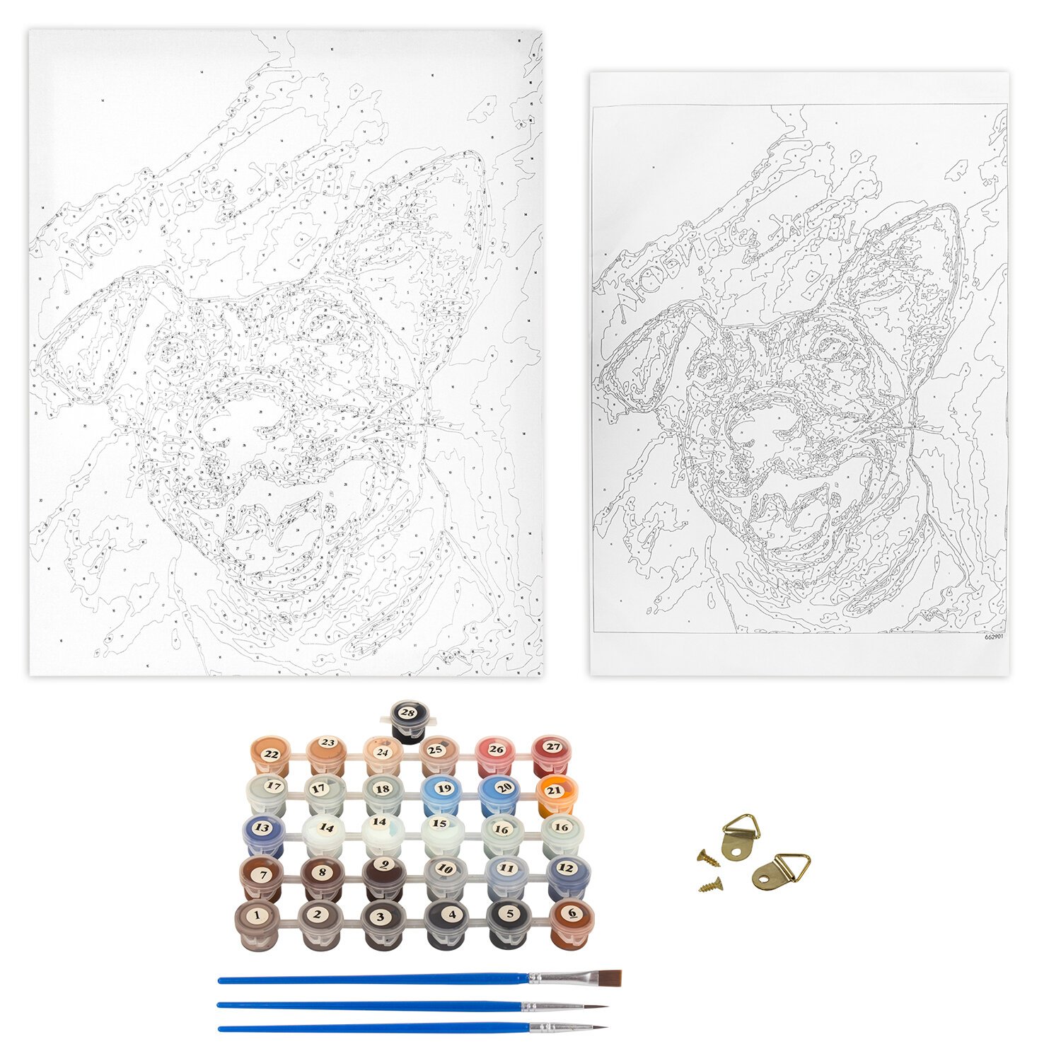 В набор входит: 1 хлопковый холст на подрамнике с контуром, 1 лист бумаги для тренировки, набор из 28 акриловых красок объемом 3 мл каждая, 3 синтетические кисти и комплект металлических креплений для подвешивания на стену.
