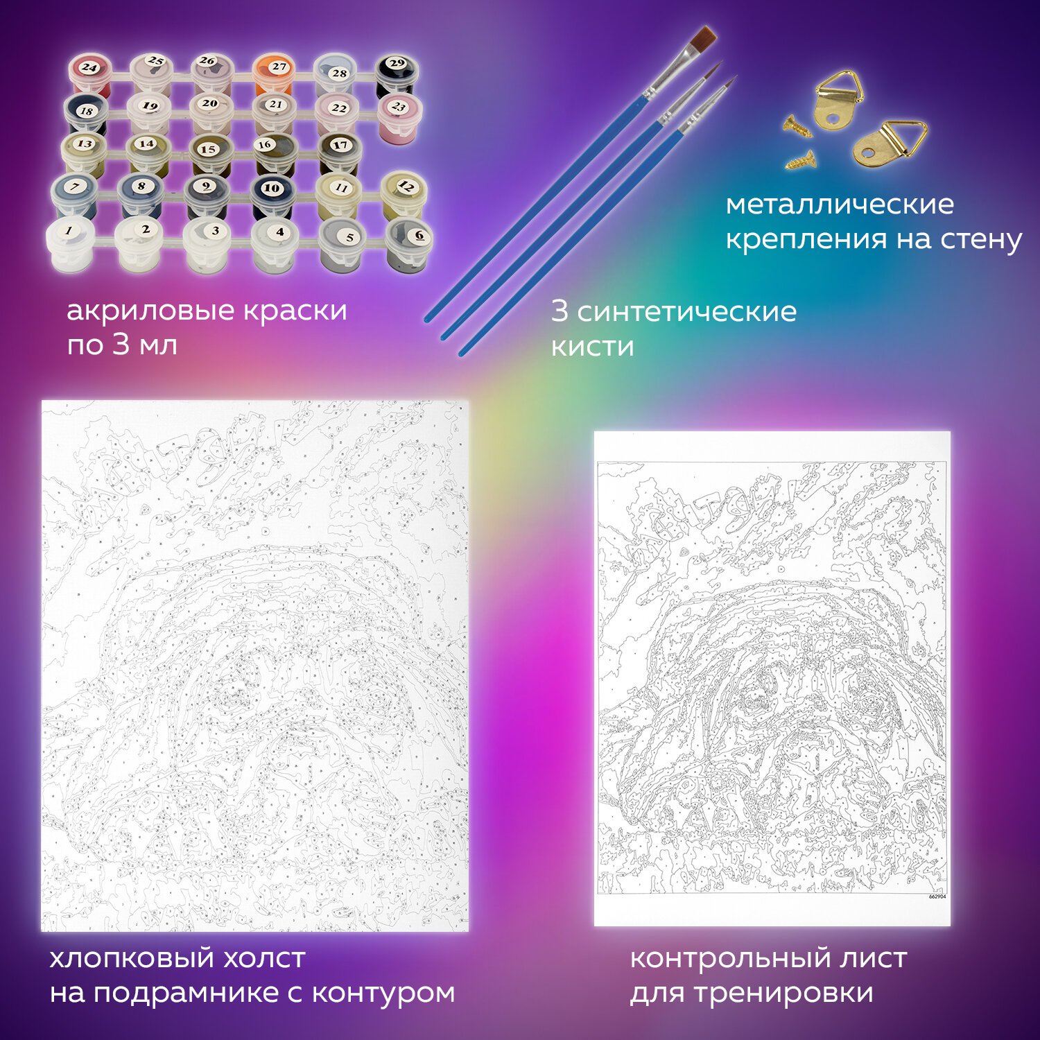 В набор входит: 1 хлопковый холст на подрамнике с контуром, 1 лист бумаги для тренировки, набор из 29 акриловых красок объемом 3 мл каждая, 3 синтетические кисти и комплект металлических креплений для подвешивания на стену.