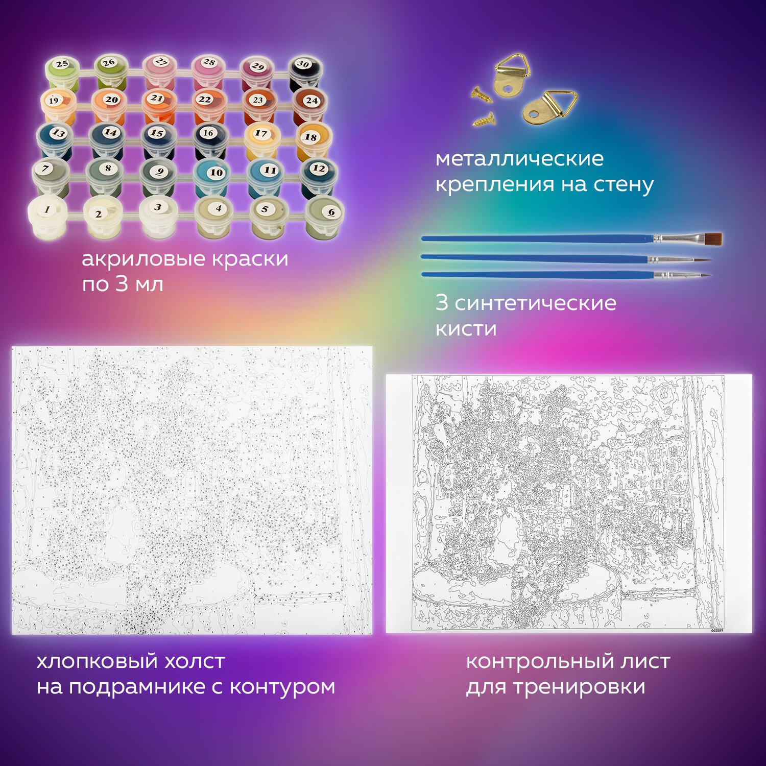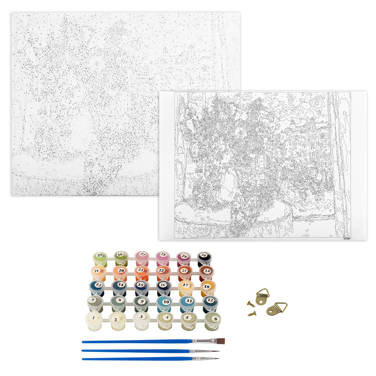В набор входит: 1 хлопковый холст на подрамнике с контуром, 1 лист бумаги для тренировки, набор из 30 акриловых красок объемом 3 мл каждая, 3 синтетические кисти и комплект металлических креплений для подвешивания на стену.