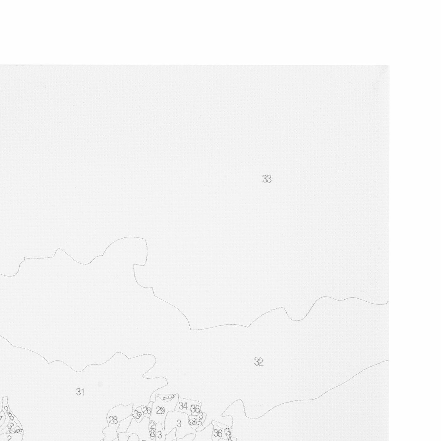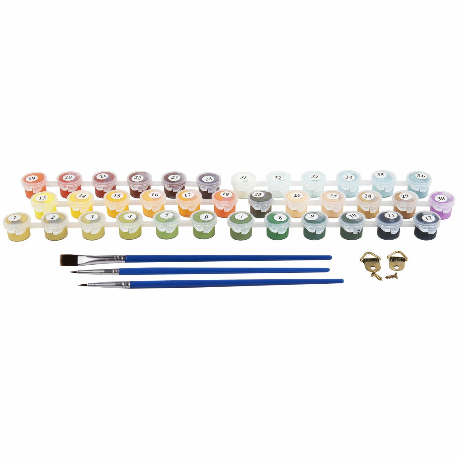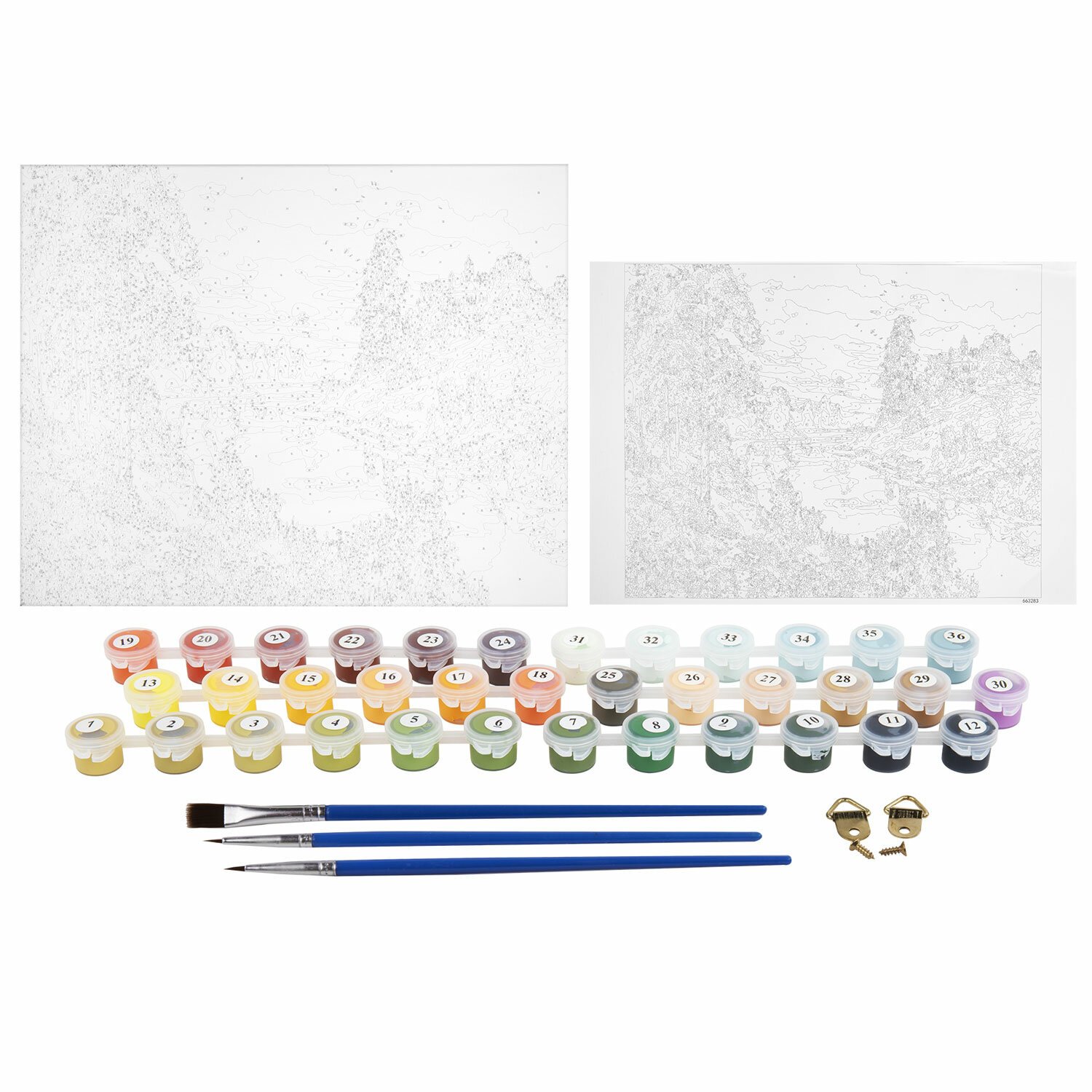 В набор входит: 1 хлопковый холст на подрамнике с контуром, 1 лист бумаги для тренировки, набор из 36 акриловых красок объемом 3 мл каждая, 3 синтетические кисти и комплект металлических креплений для подвешивания на стену.