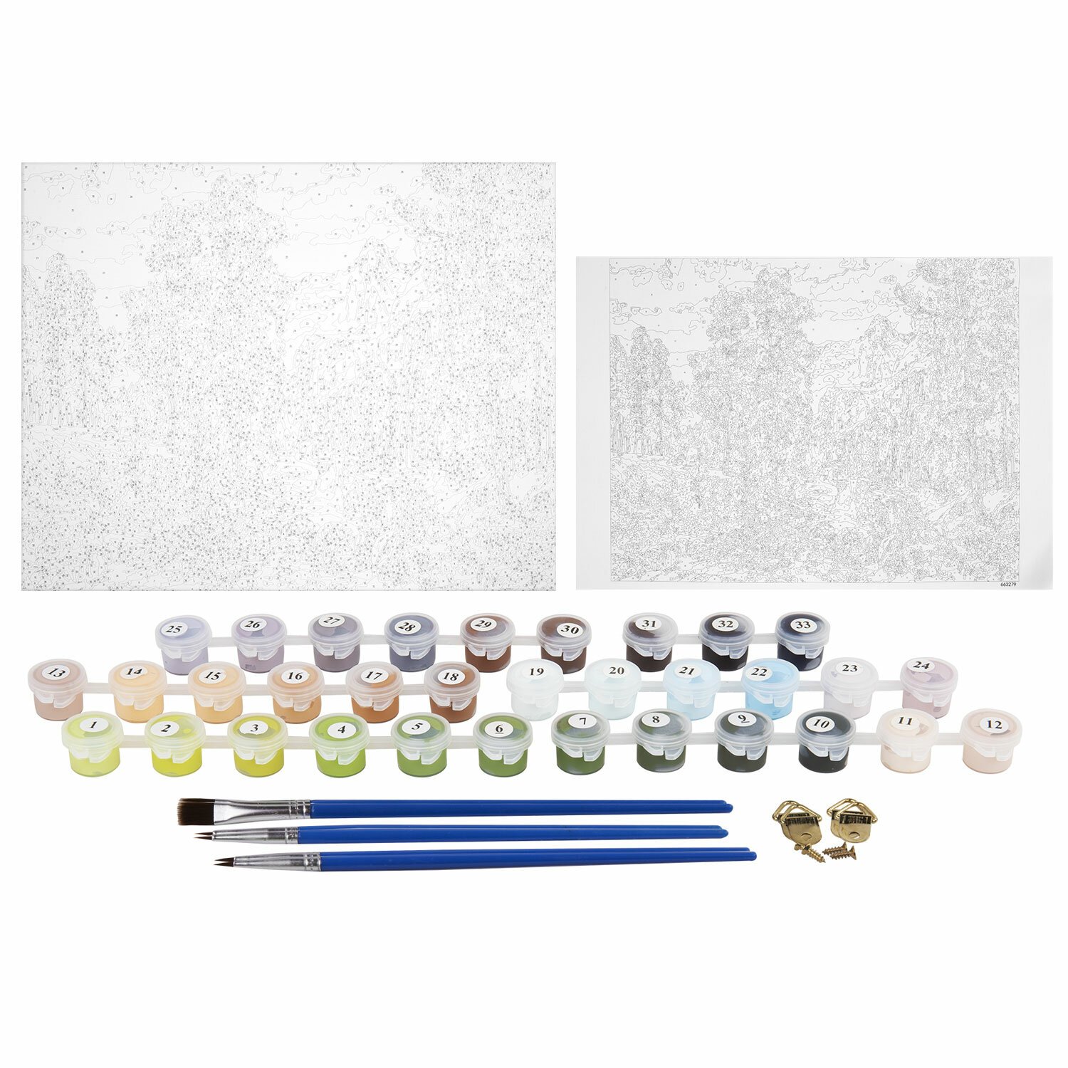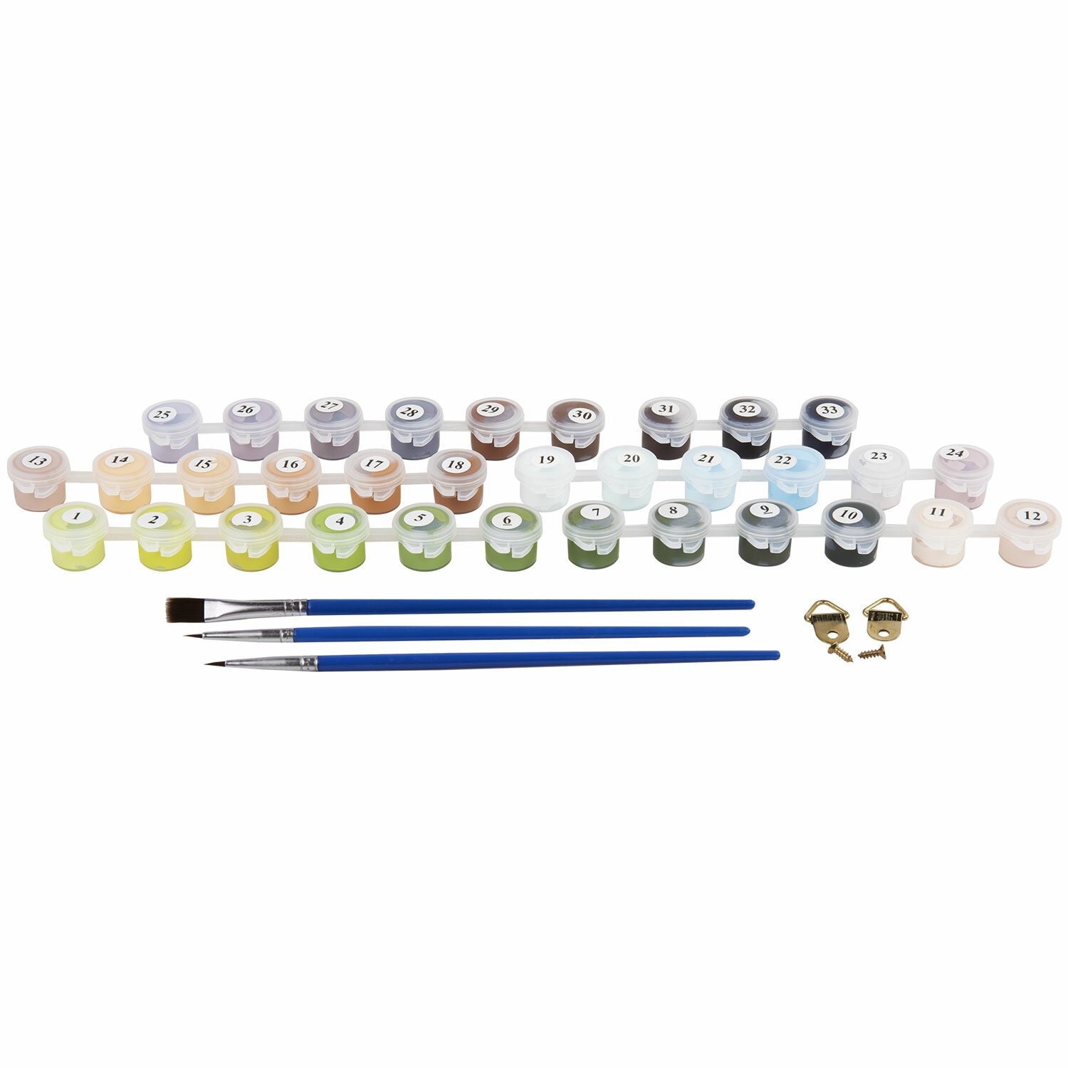 В набор входит: 1 хлопковый холст на подрамнике с контуром, 1 лист бумаги для тренировки, набор из 33 акриловых красок объемом 3 мл каждая, 3 синтетические кисти и комплект металлических креплений для подвешивания на стену.