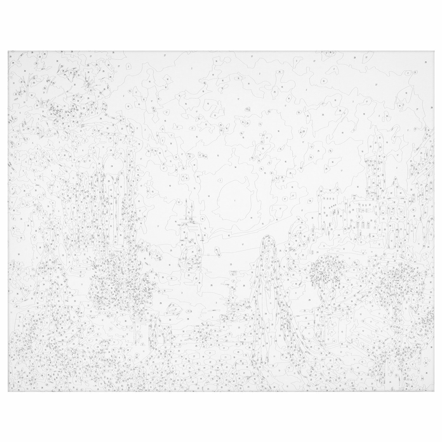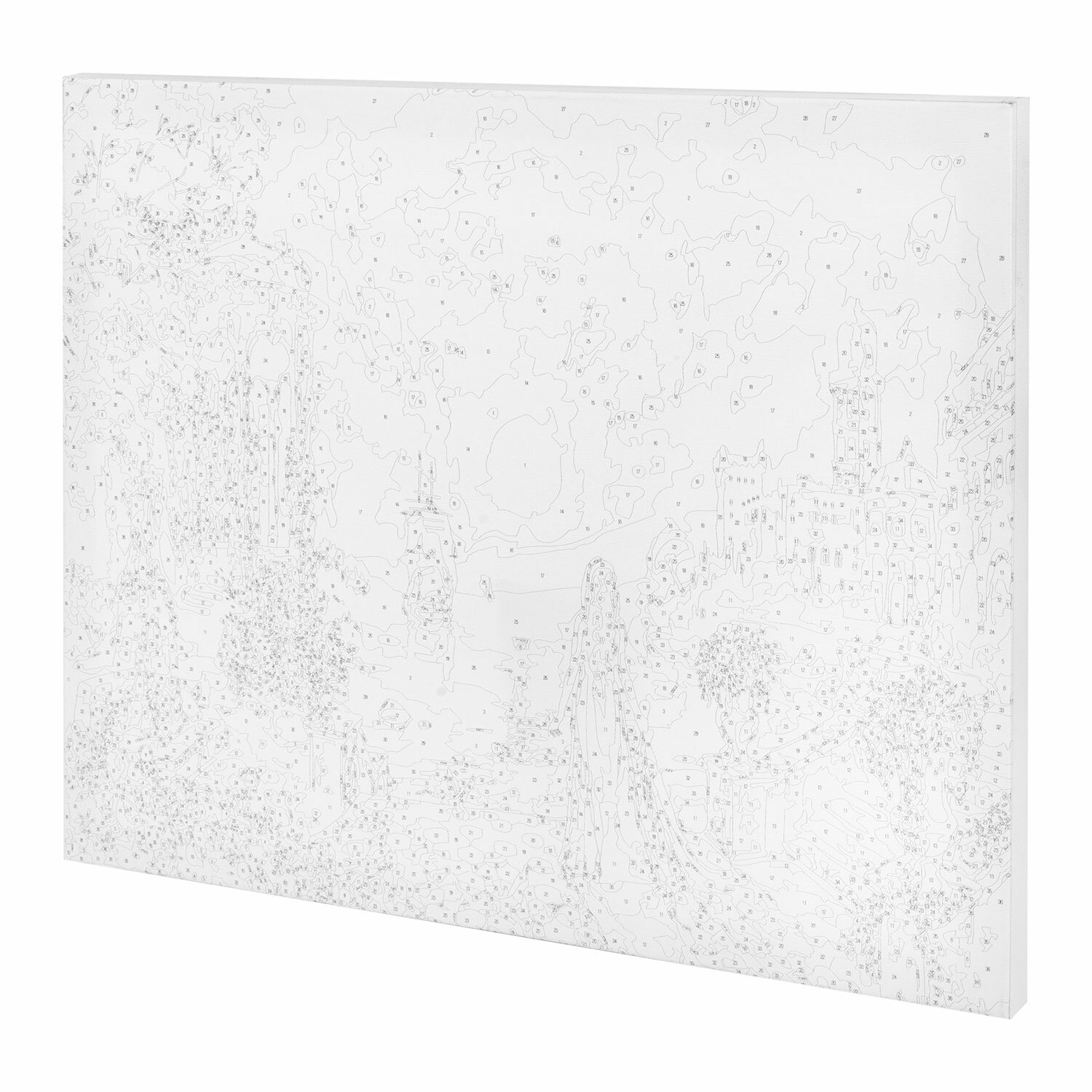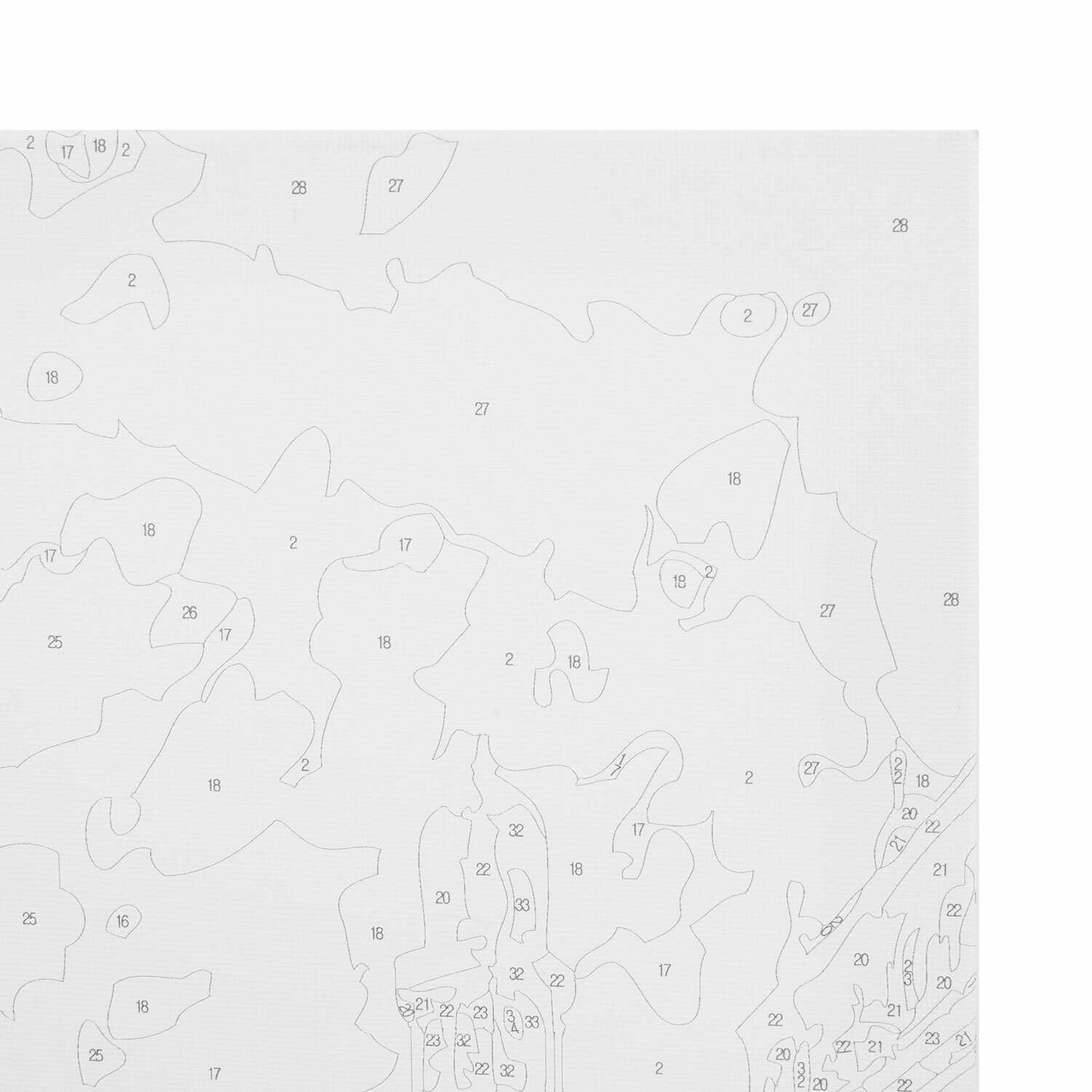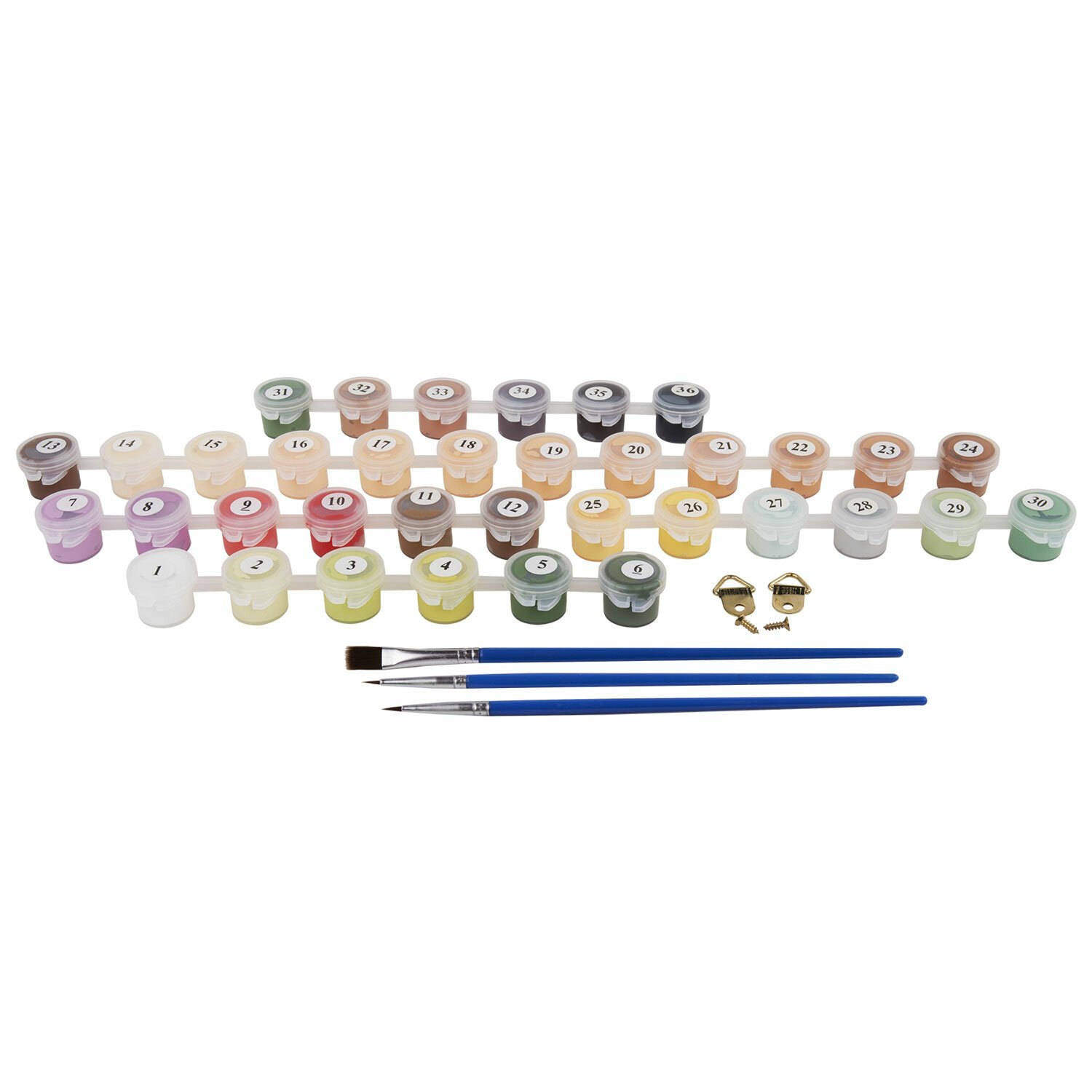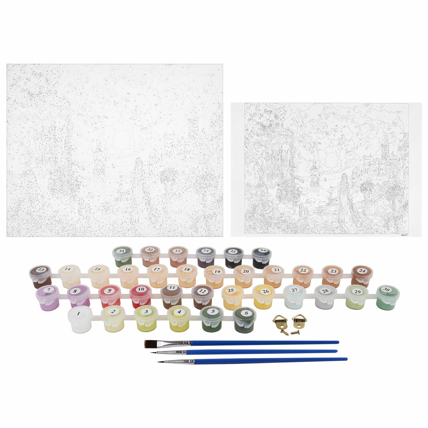 В набор входит: 1 хлопковый холст на подрамнике с контуром, 1 лист бумаги для тренировки, набор из 36 акриловых красок объемом 3 мл каждая, 3 синтетические кисти и комплект металлических креплений для подвешивания на стену.
